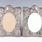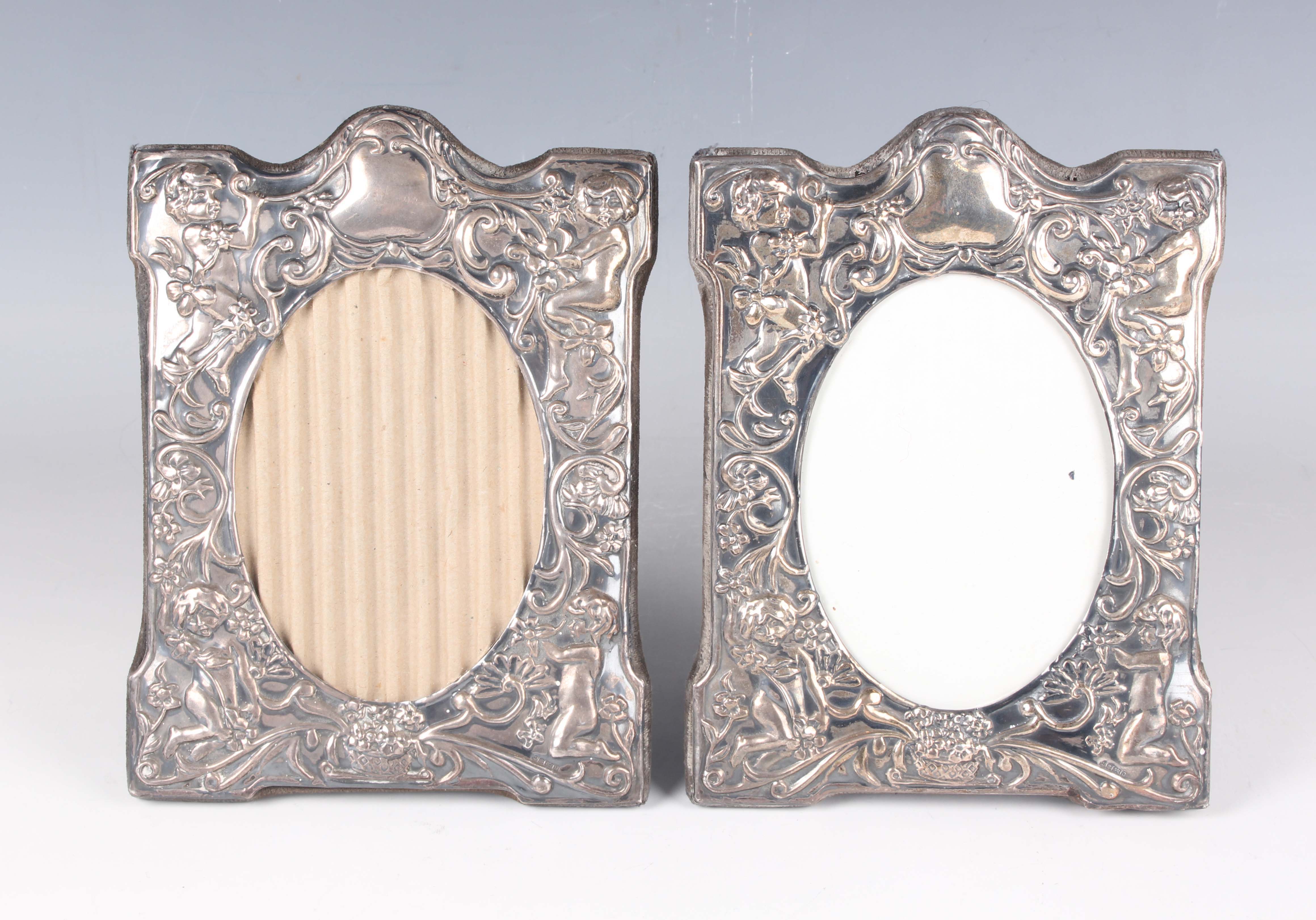 A pair of Elizabeth II silver mounted shaped rectangular photograph frames, embossed with putti amongst flowering and foliate scrolls, Sheffield 1890 by DR&S, height 19cm.
