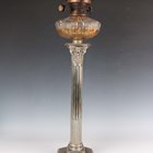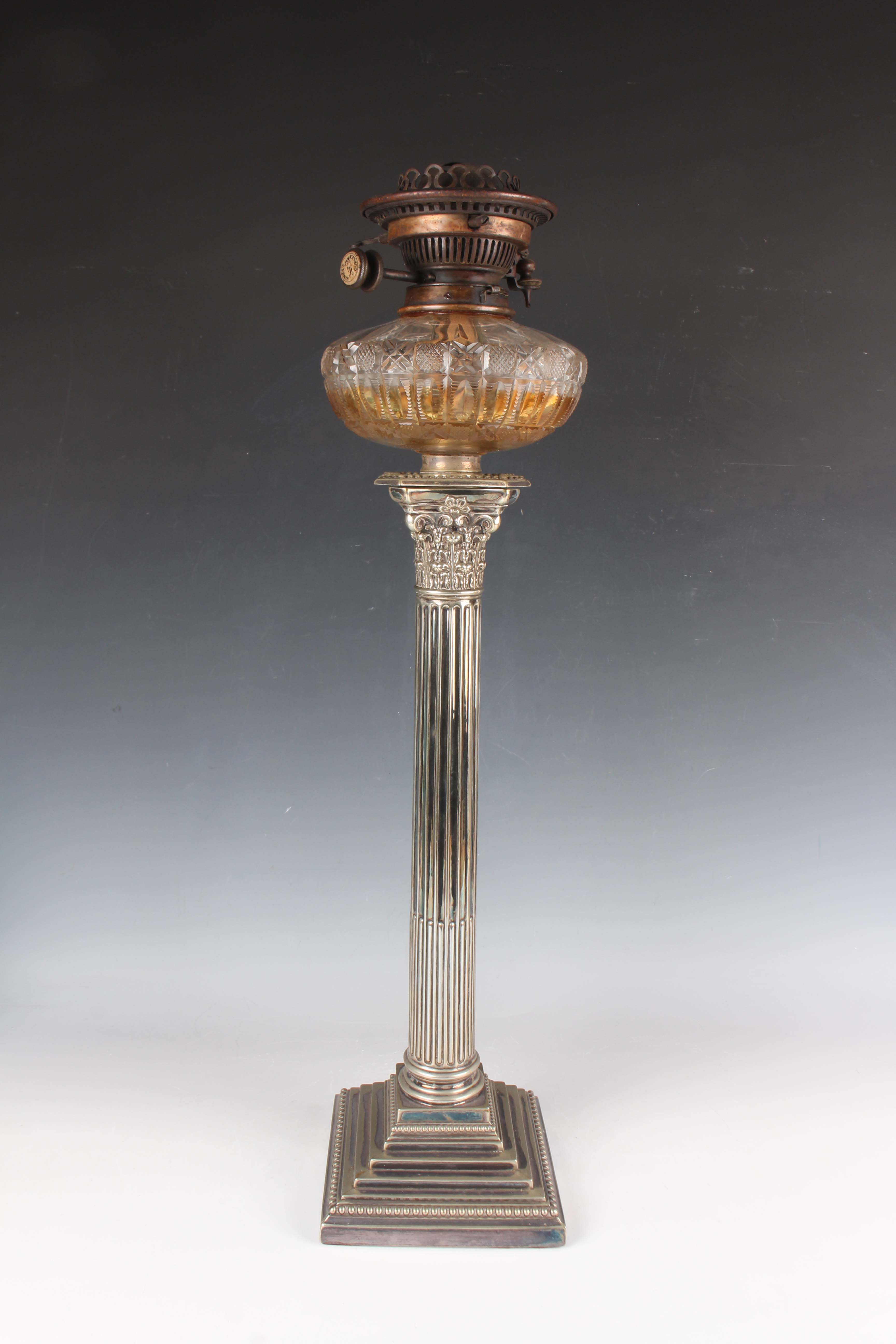 A late 19th/early 20th century plated Corinthian column table oil lamp with cut glass reservoir, detailed 'Hink's & Son's Patent' to collar and 'Hink's No. 2 Duplex' to winder, total height 64cm.