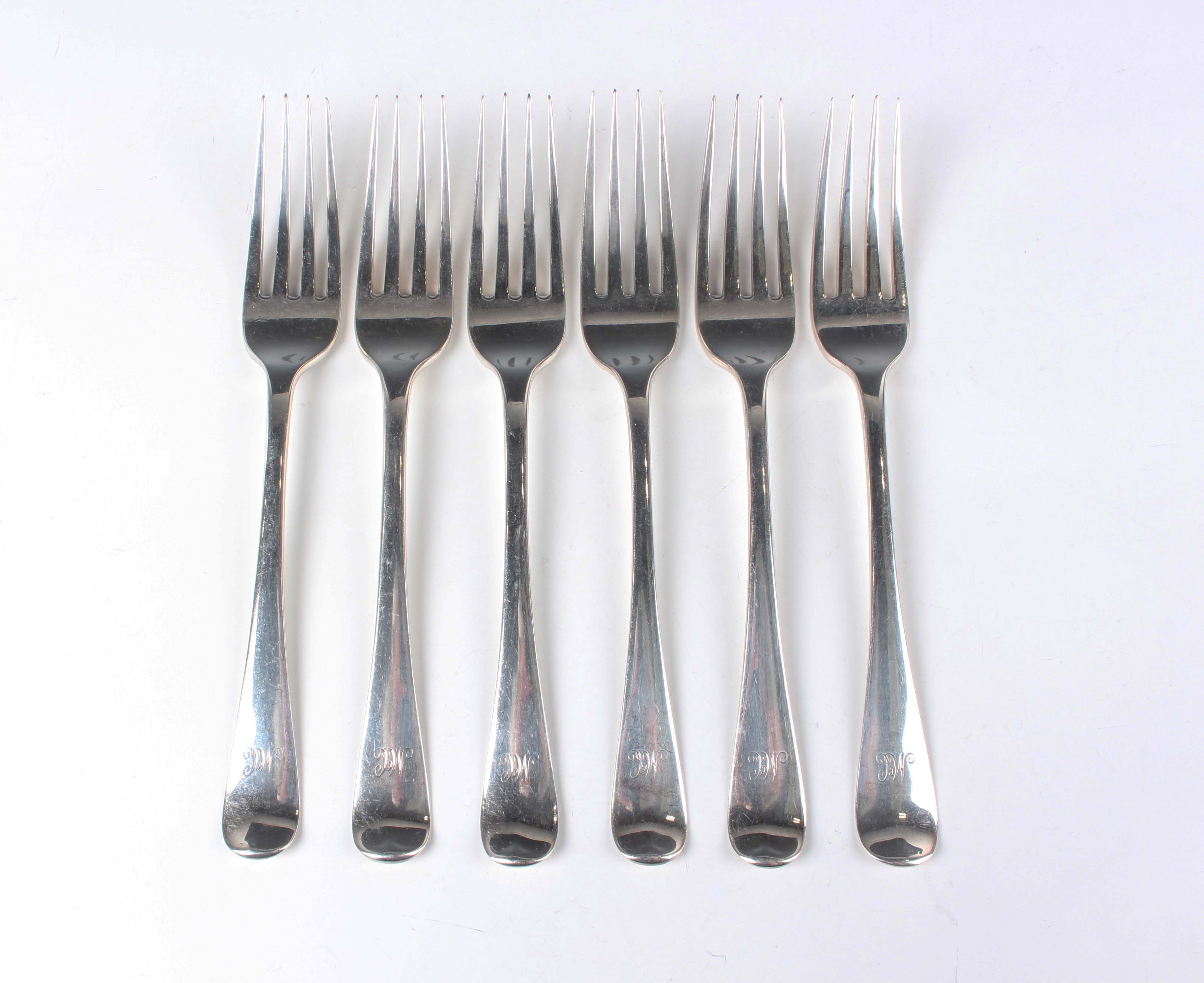 A set of six George III Scottish silver Hanoverian pattern table forks, Edinburgh 1817 by JM, total weight 362.4g, length 20cm.