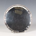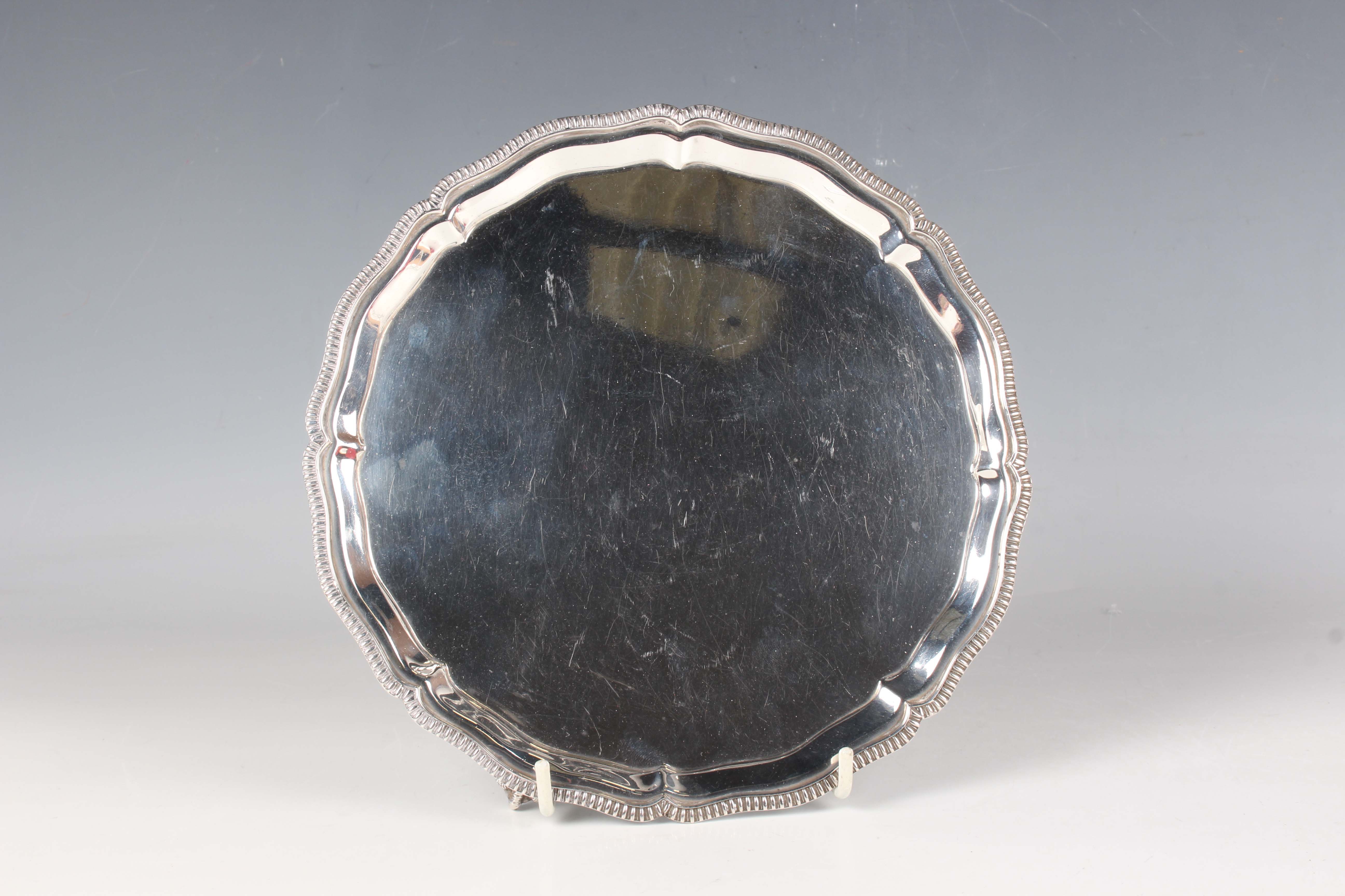 A George V silver circular card salver with piecrust and gadrooned rim, raised on claw and ball feet, Sheffield 1933 by Mappin & Webb Ltd, weight 331.2g, diameter 20.5cm.