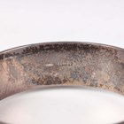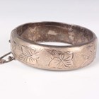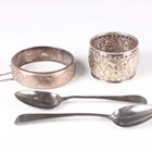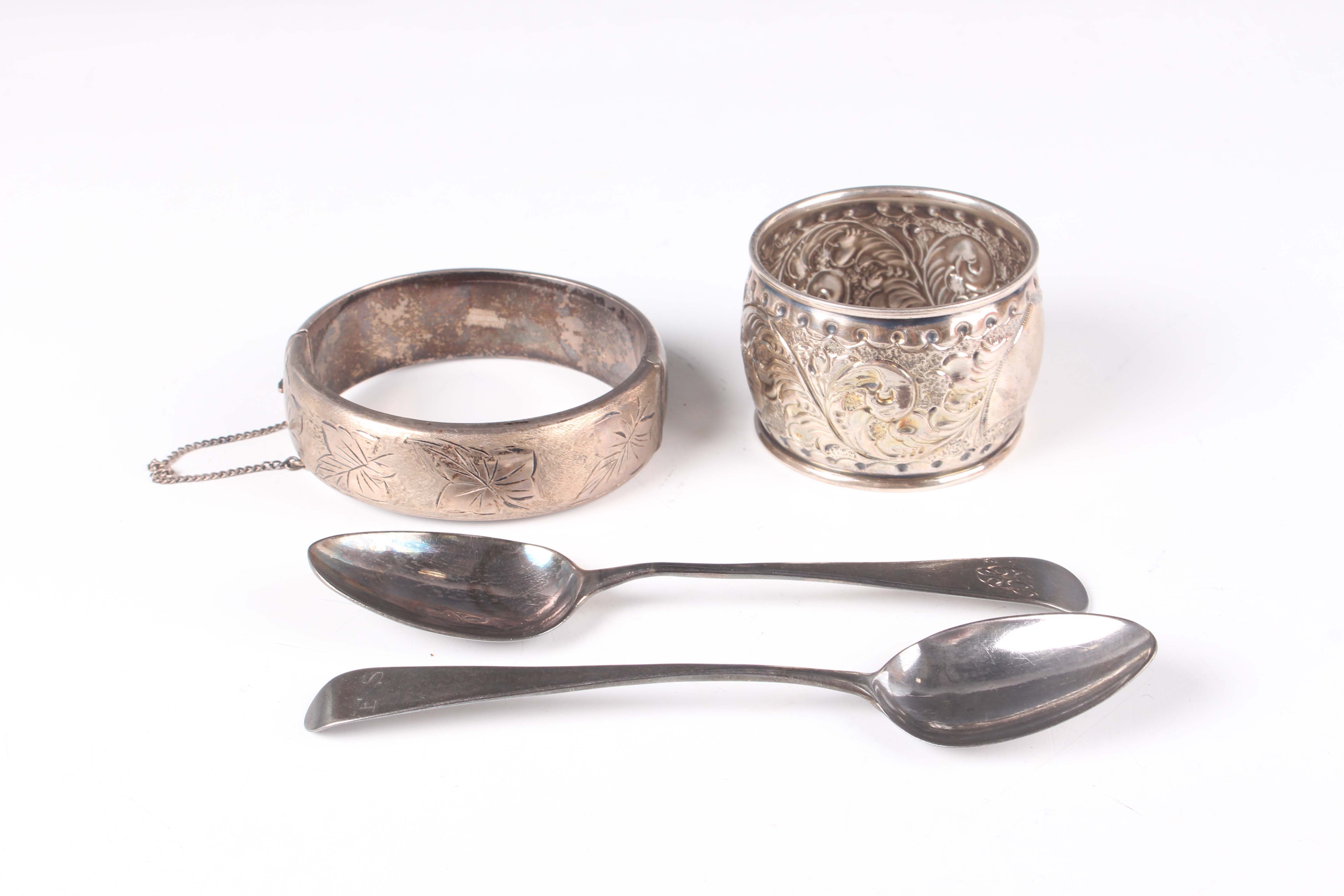A small group of silver, comprising two Old English pattern teaspoons, London 1797 and 1816, an oval hinged bangle, the front engraved with ivy leaves, Birmingham 1971, inside width 6cm, and a napkin ring, Birmingham 1984, total weight 65.8g.