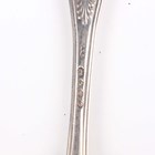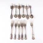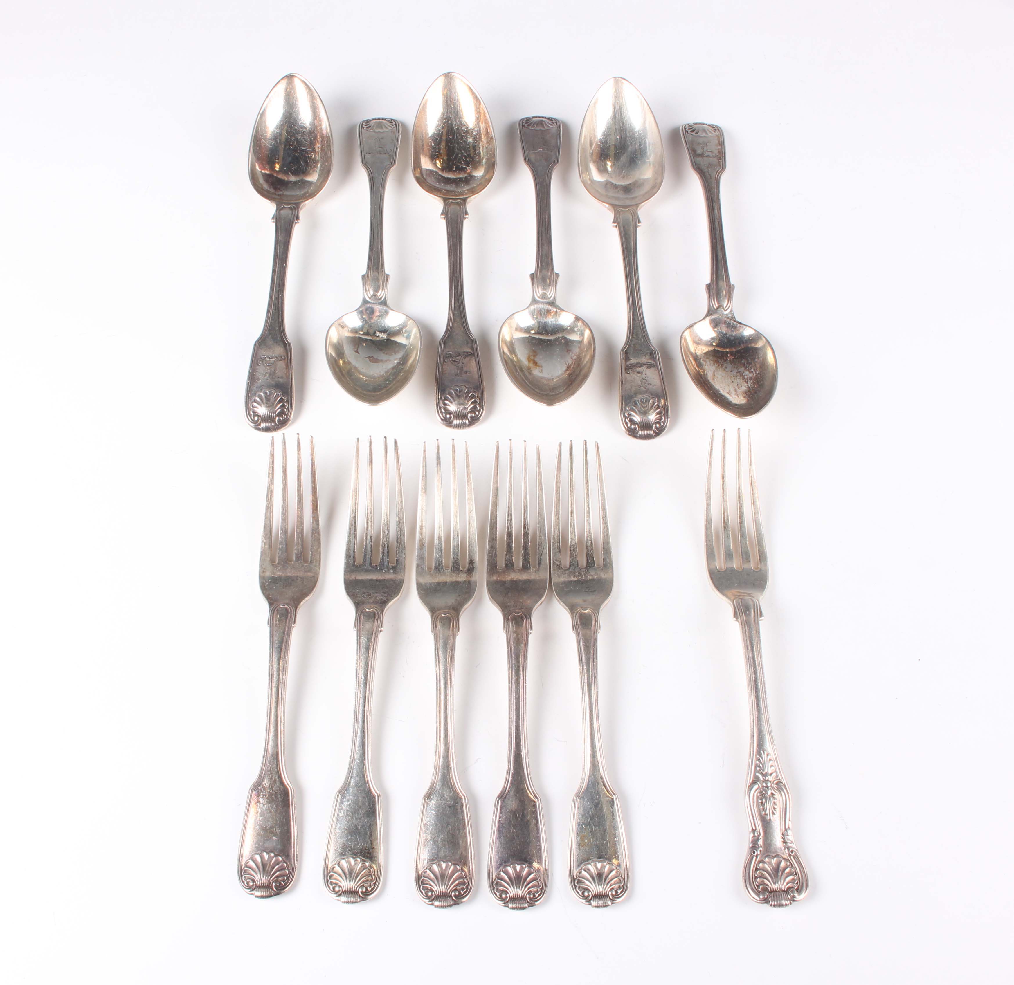 A set of six George III silver Fiddle, Thread and Shell pattern dessert spoons, crest engraved, London 1818 by Thomas Wallis & Jonathan Hayne, a set of five silver Fiddle, Thread and Shell pattern dessert forks, London 1812 by William Eley I, William Fearn & William Chawner, and a silver King's pattern dessert fork, London 1846, total weight 744.8g.
