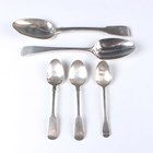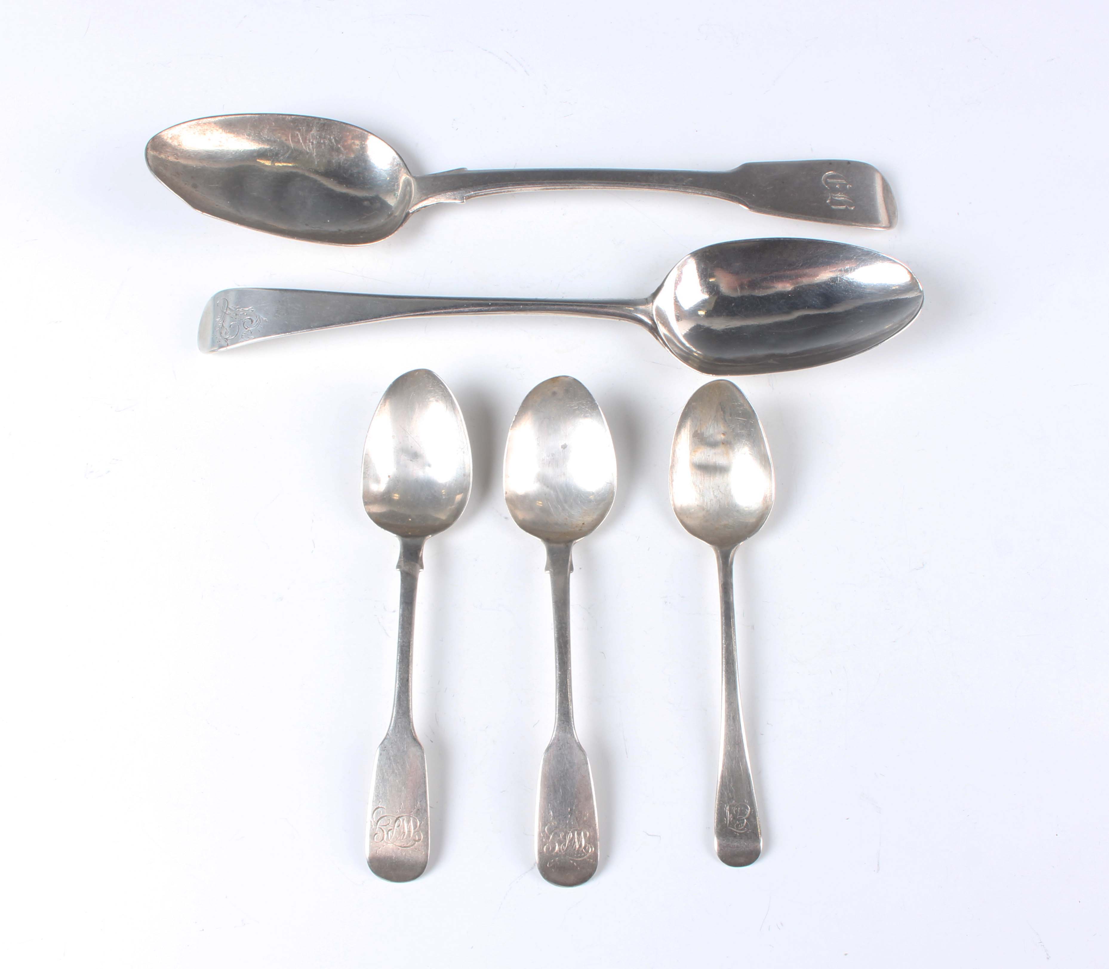 A group of five silver spoons, comprising a Fiddle pattern tablespoon, London 1820, an Old English pattern tablespoon, London 1775 by Hester Bateman, and three teaspoons, total weight 165.7g.