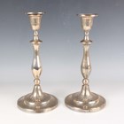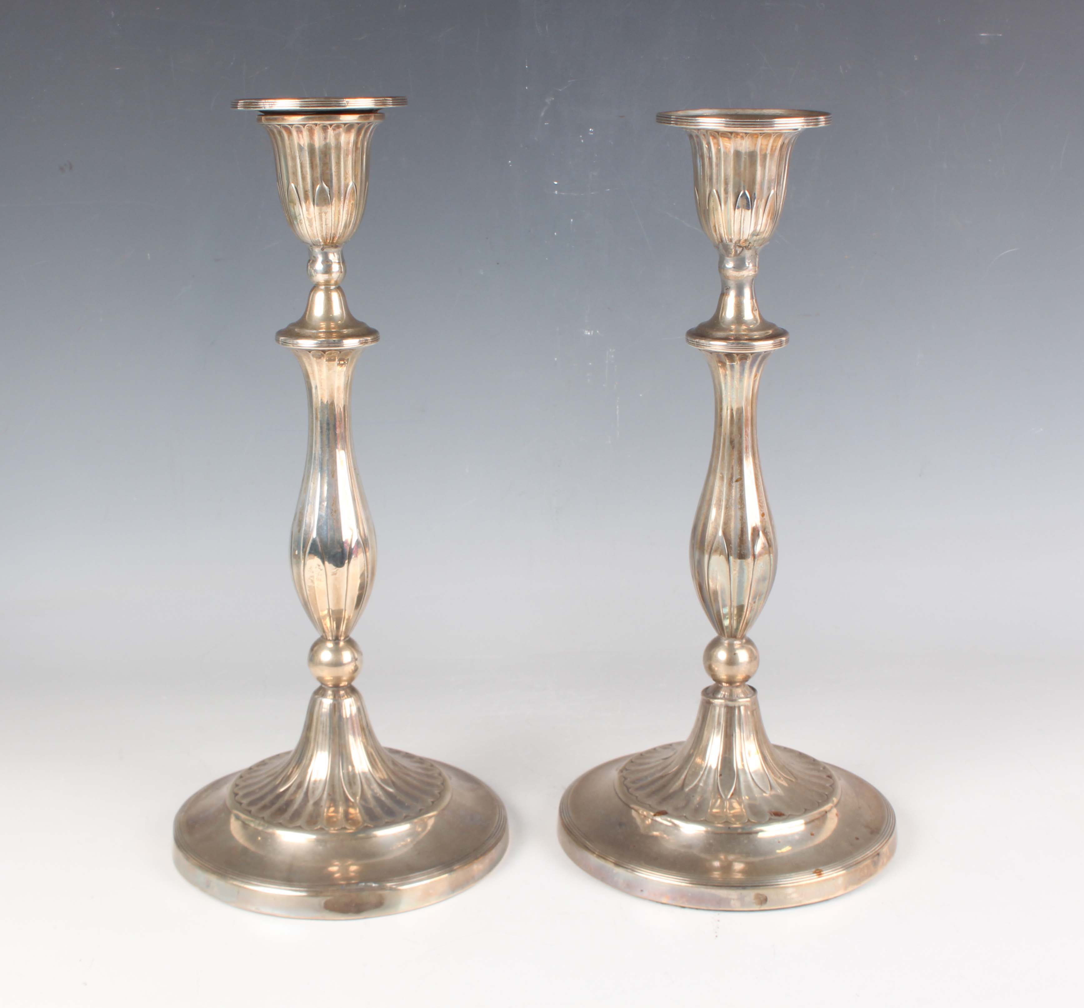 A pair of George III silver candlesticks, each with reeded and foliate urn shaped sconce and detachable nozzle, on a similarly decorated baluster stem and circular foot, Sheffield 1796 and 1798 by Richard Morton & Co, height 29.5cm.