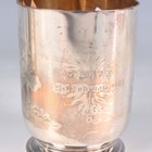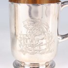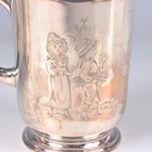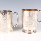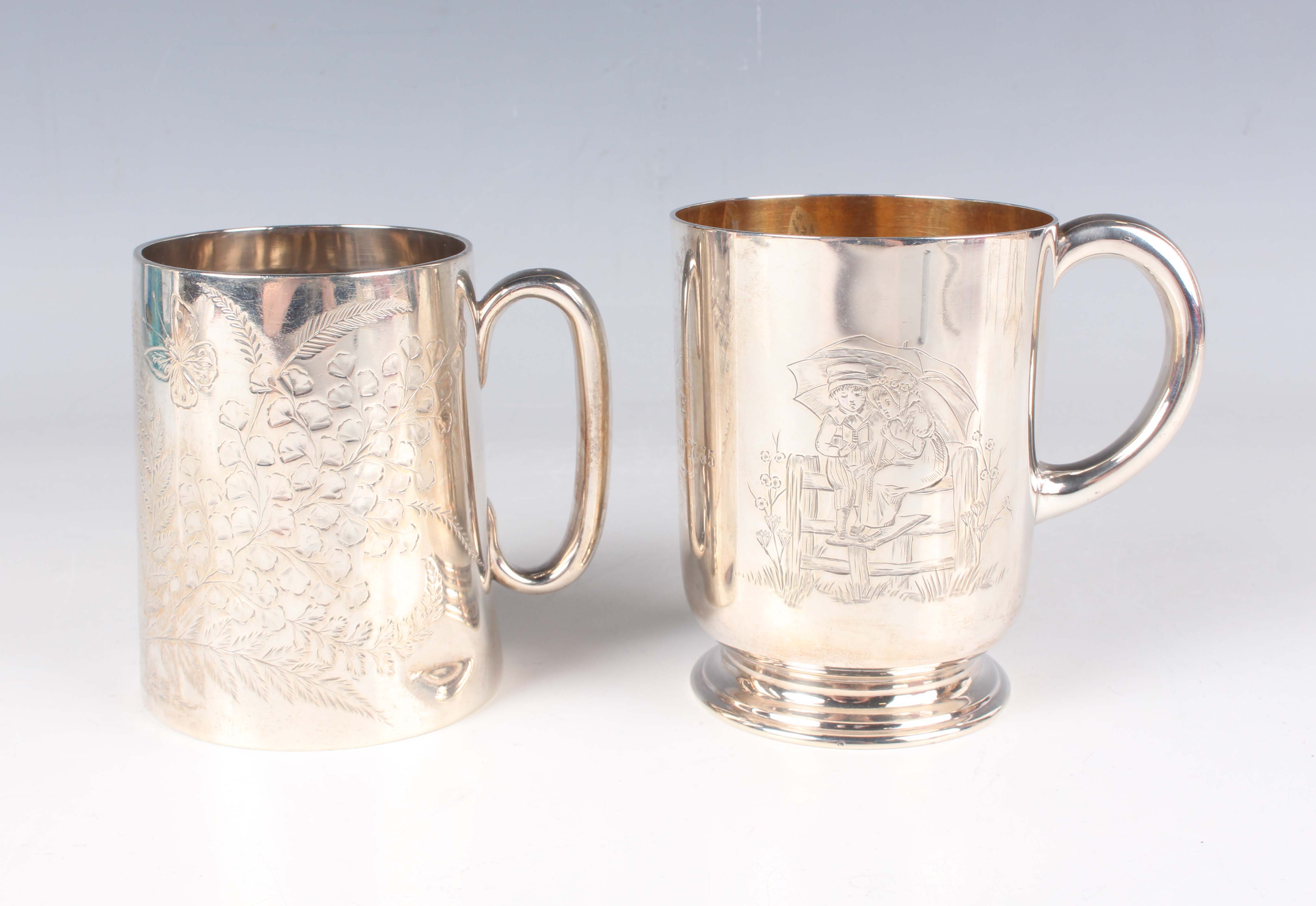 A Victorian silver christening mug, the cylindrical body engraved with Kate Greenaway style children decoration and name and date engraved, flanked by a loop handle, on a circular foot, London 1884 by Walter & John Barnard, height 9.3cm, and another silver christening mug of tapering cylindrical form, engraved with butterflies amongst fern fronds, initial engraved, flanked by a loop handle, London 1884 by Martin Goldstein, height 8.7cm, total weight 335.9g.