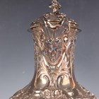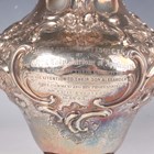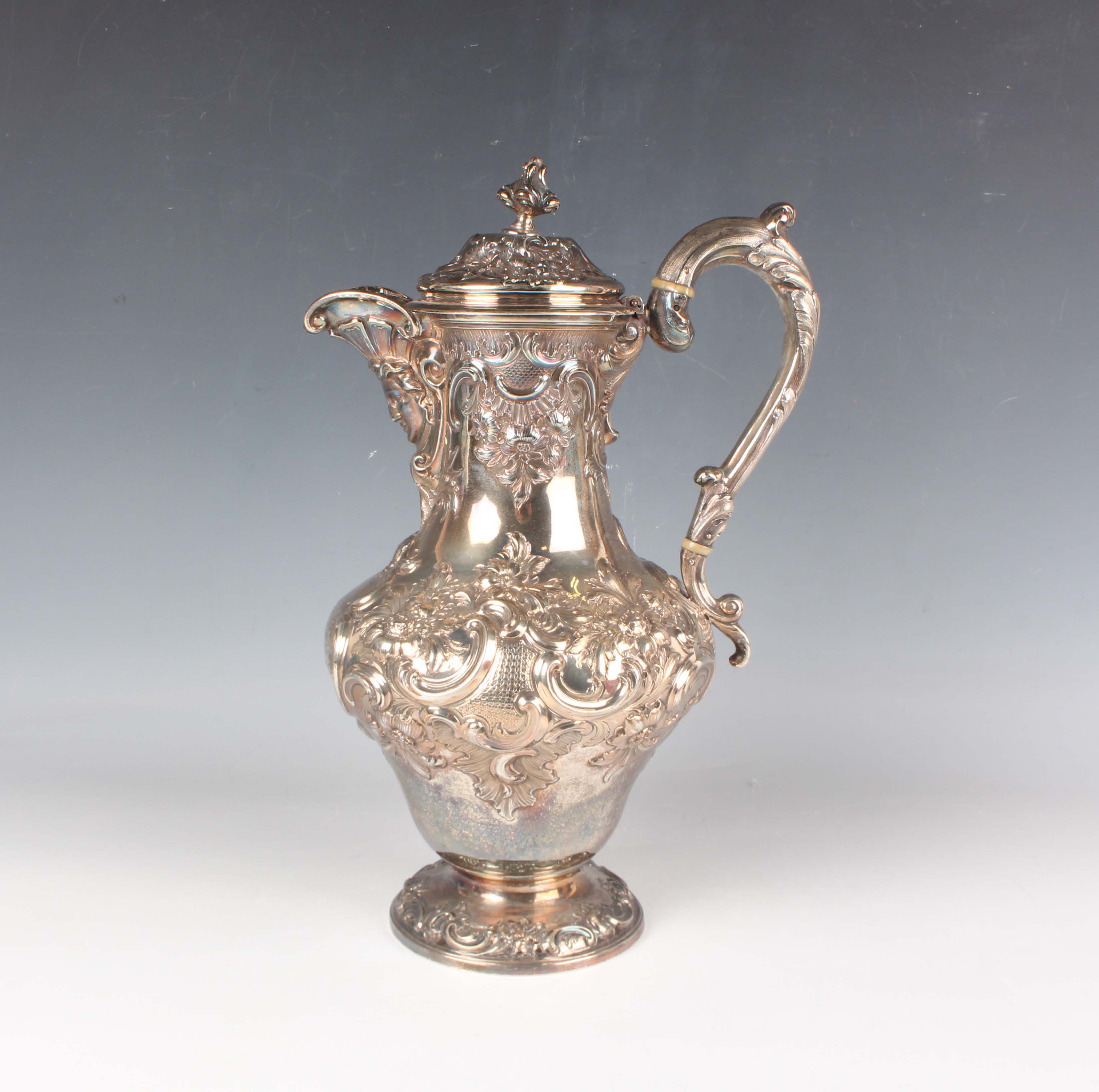 An early Victorian Scottish silver hot water pot of baluster form with hinged lid and foliate finial above a mask spout and scroll handle, chased with flowers, 'C' scrolls and lattice panels, the front inscription engraved 'Presented to James Abernethy Esq C.E, Sir Wm & Lady Jardine of Applegirth as a mark of their gratitude for his attention to their son Alexander when commencing his Profession as Civil Engineer in 1845', on a similarly decorated circular foot, Edinburgh 1839 by James Howden & Co, weight 1181.3g, height 32.5cm. Note: a non-transferrable ivory exemption certificate has been granted for the sale of this item.
