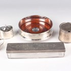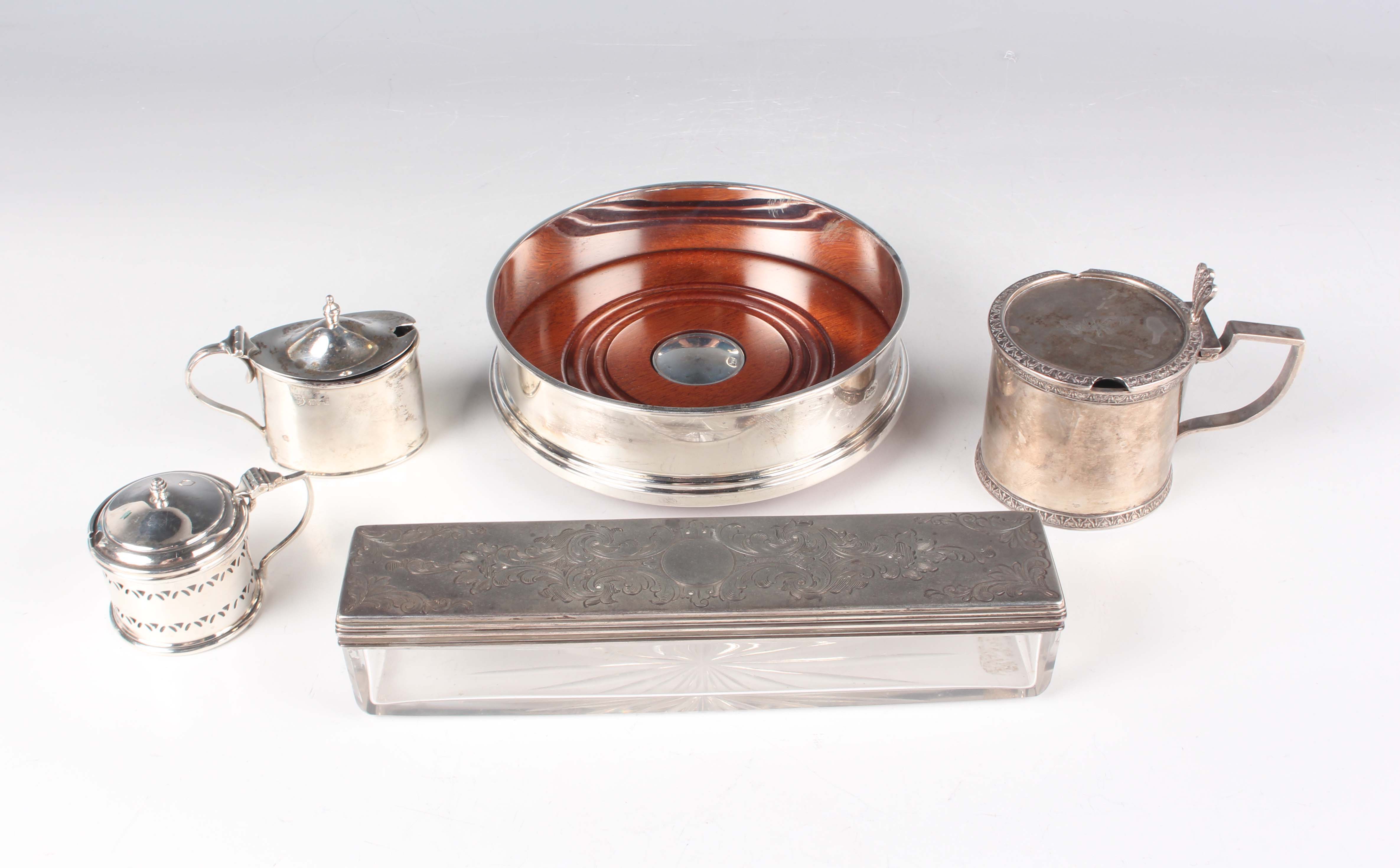 An early Victorian silver lidded cut glass rectangular dressing table box, engraved with foliate scrolls, London 1847 by John Howes, length 17.7cm, and two silver mustards, total weight excluding glass 103.9g, together with a silver wine coaster, Sheffield 2004, and a white metal mustard.