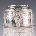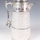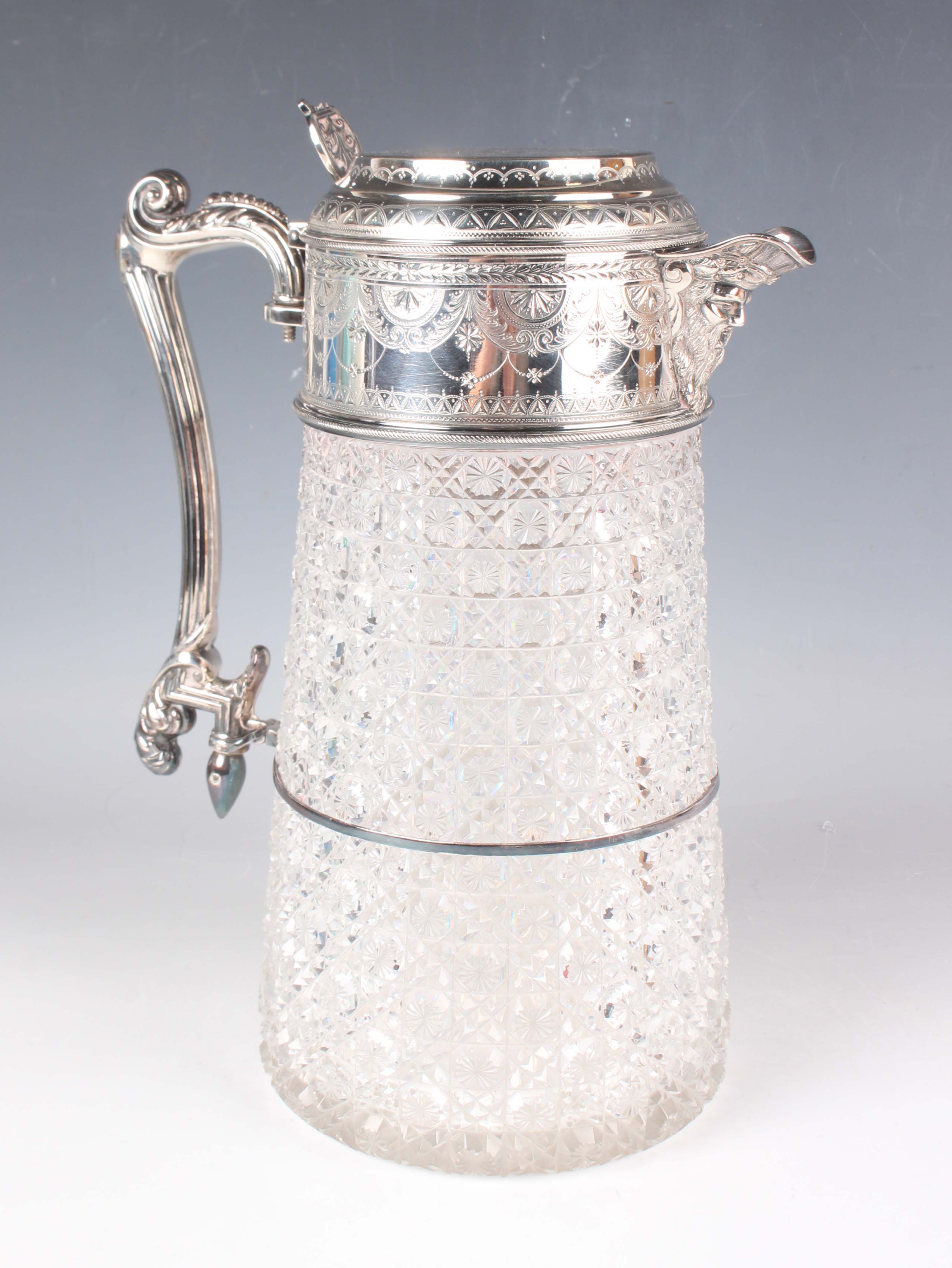 A Victorian silver mounted cut glass lemonade jug of tapering cylindrical form, the silver collar and hinged tappit lid engraved with bright-cut decoration, flanked by a mask spout and reeded foliate scroll handle, London 1882 by William Hutton & Sons, height 29cm.