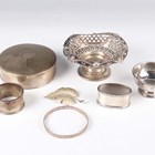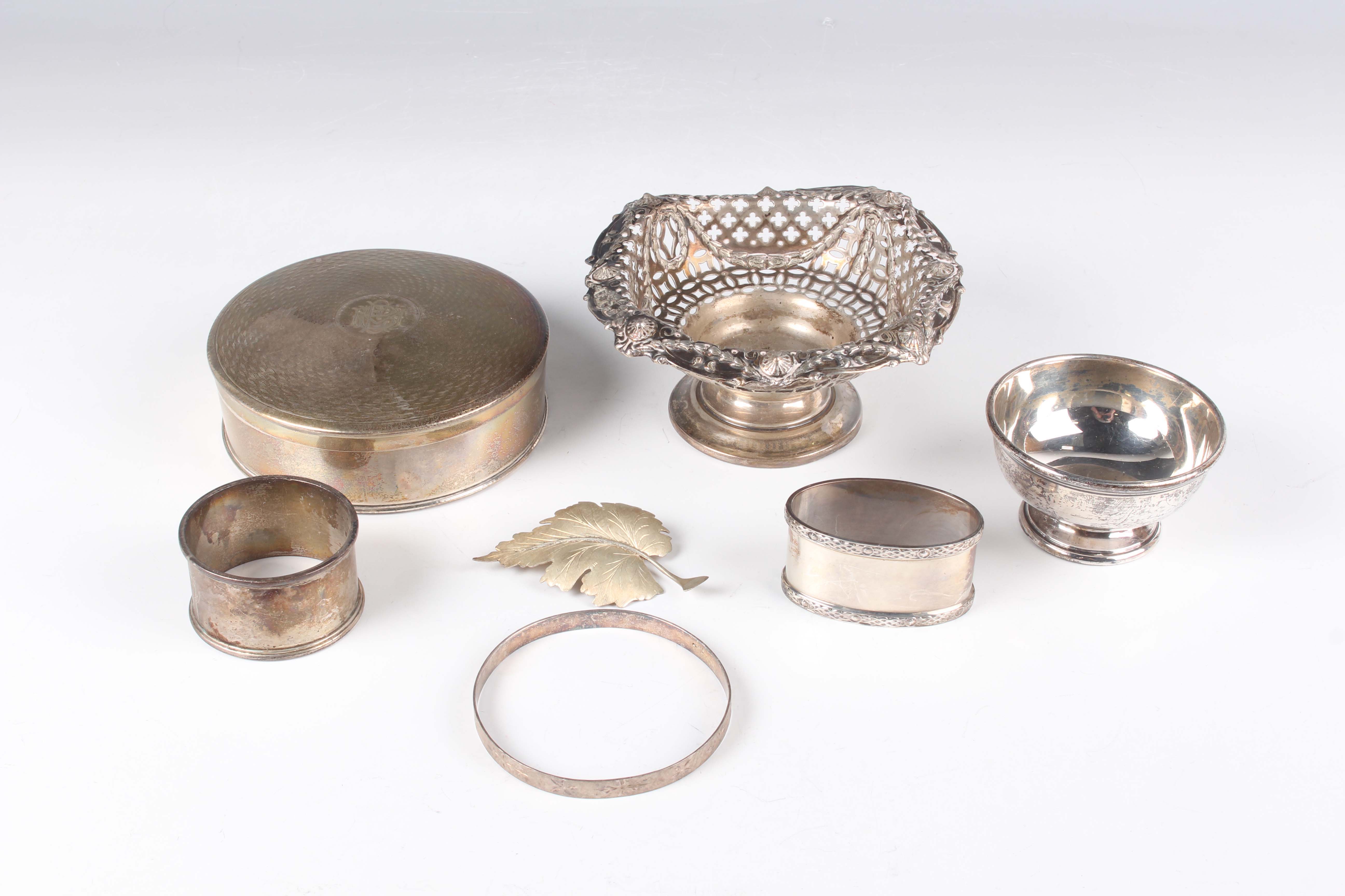 A late Victorian silver bonbon dish with pierced and embossed sides, on a circular stepped foot, London 1898 by Goldsmiths & Silversmiths Co, and a small group of other silver, comprising a bowl and cover, Birmingham 1919, two napkin rings, a small footed bowl and a leaf shaped brooch, total weight 326.2g, and a .800 silver bangle with engraved decoration, weight 10.1g, inside diameter 6.4cm.