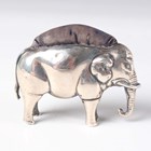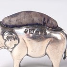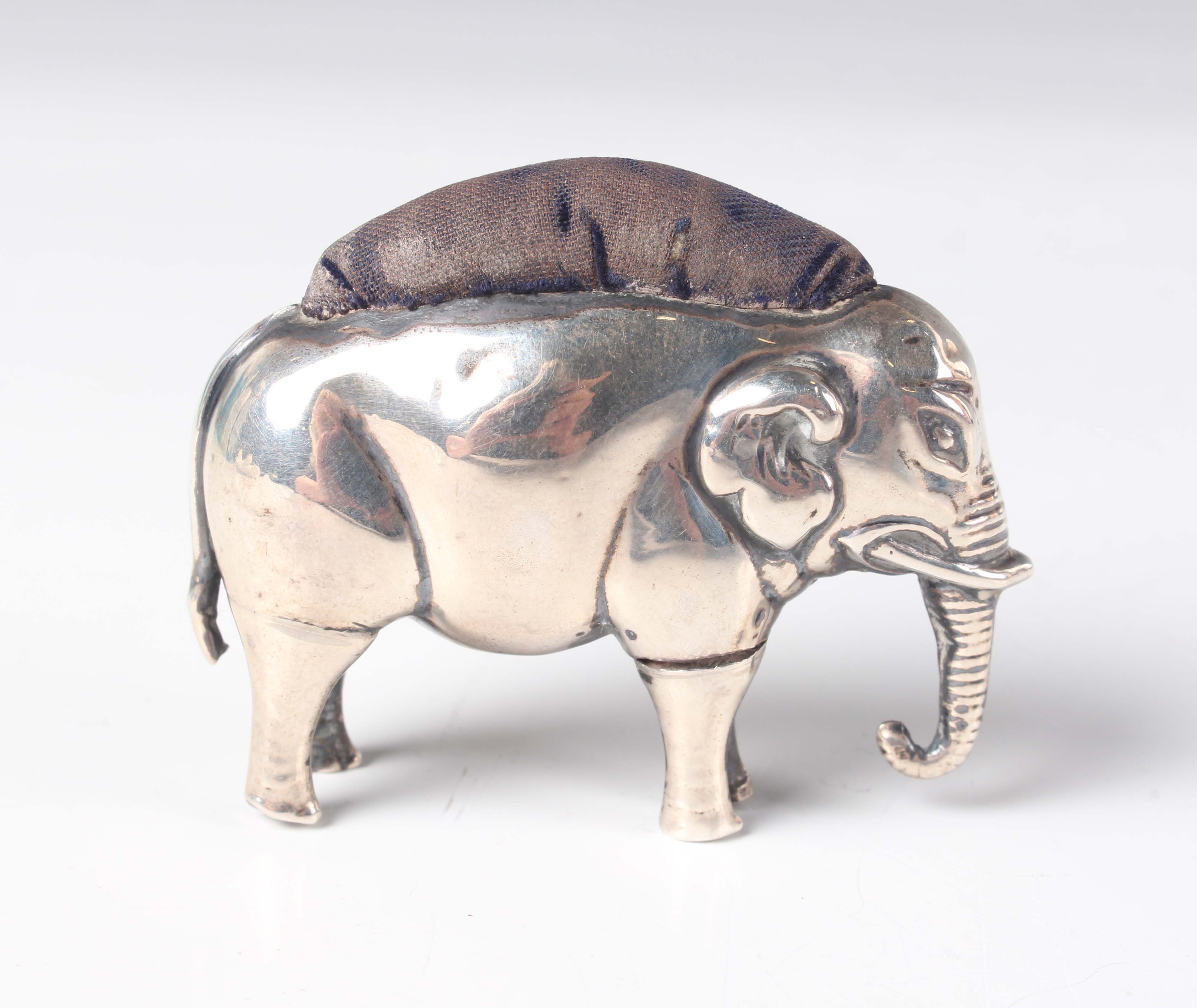 An Edwardian silver novelty pin cushion in the form of a standing elephant, Chester 1905, maker's mark indistinct, length 6cm, height 4.7cm.