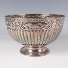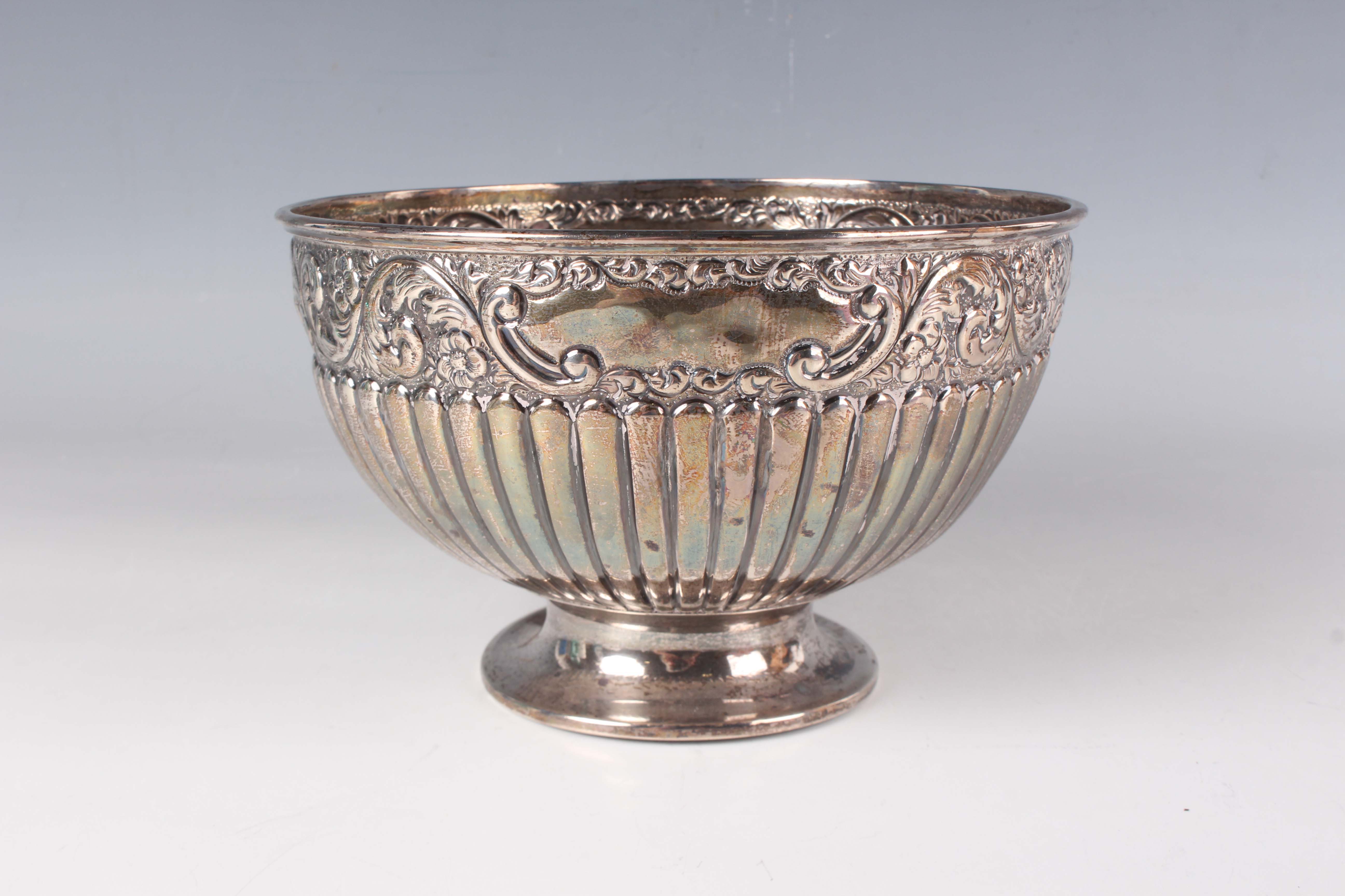 A late Victorian silver half-reeded rose bowl, embossed with a band of flowers and foliate scrolls, on a circular foot, Birmingham 1900 by Thomas Latham & Ernest Moreton, weight 258.5g, diameter 17cm, height 10.5cm.