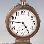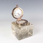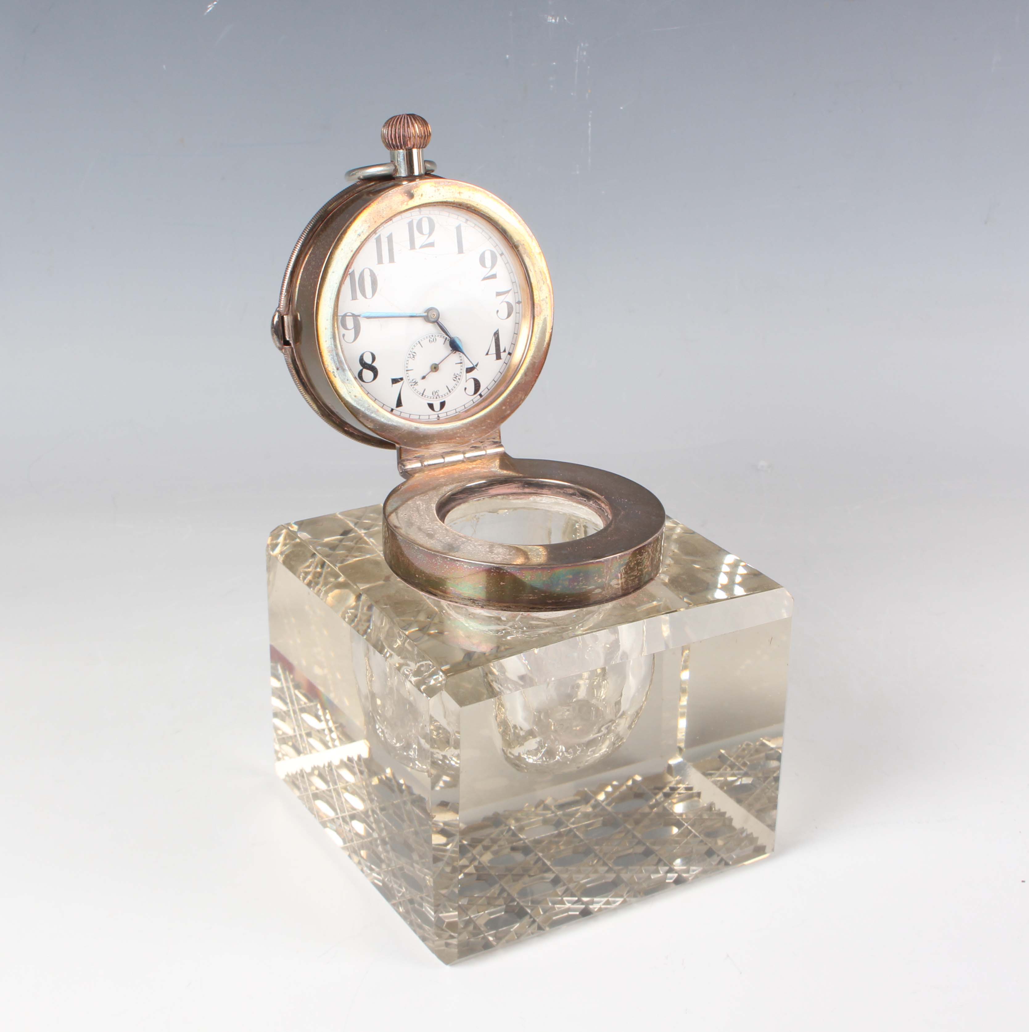 An Edwardian silver mounted square cut glass inkwell, the hinged lid with screw top, Birmingham 1904 by John Grinsell & Sons, the lid fitted with a plated Goliath watch, the white dial with Arabic numerals, total height 11cm (dial cracked).