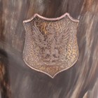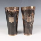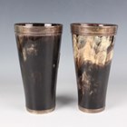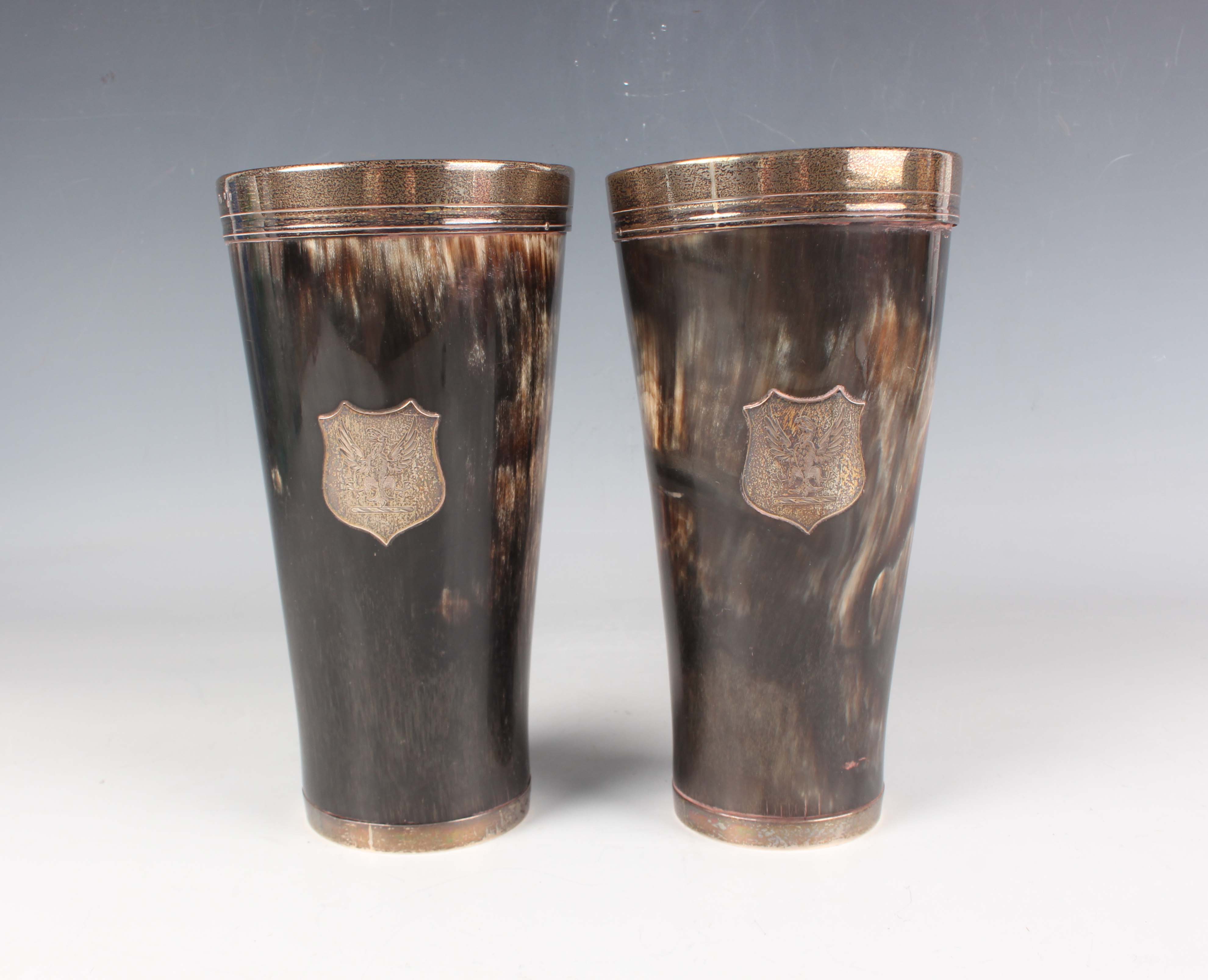A pair of Victorian silver mounted horn beakers, each tapering cylindrical body mounted with a shield shaped cartouche, engraved with an eagle crest, and fitted with a clear glass base, London 1877 by Thomas Johnson II, height 18.2cm.