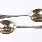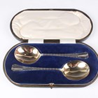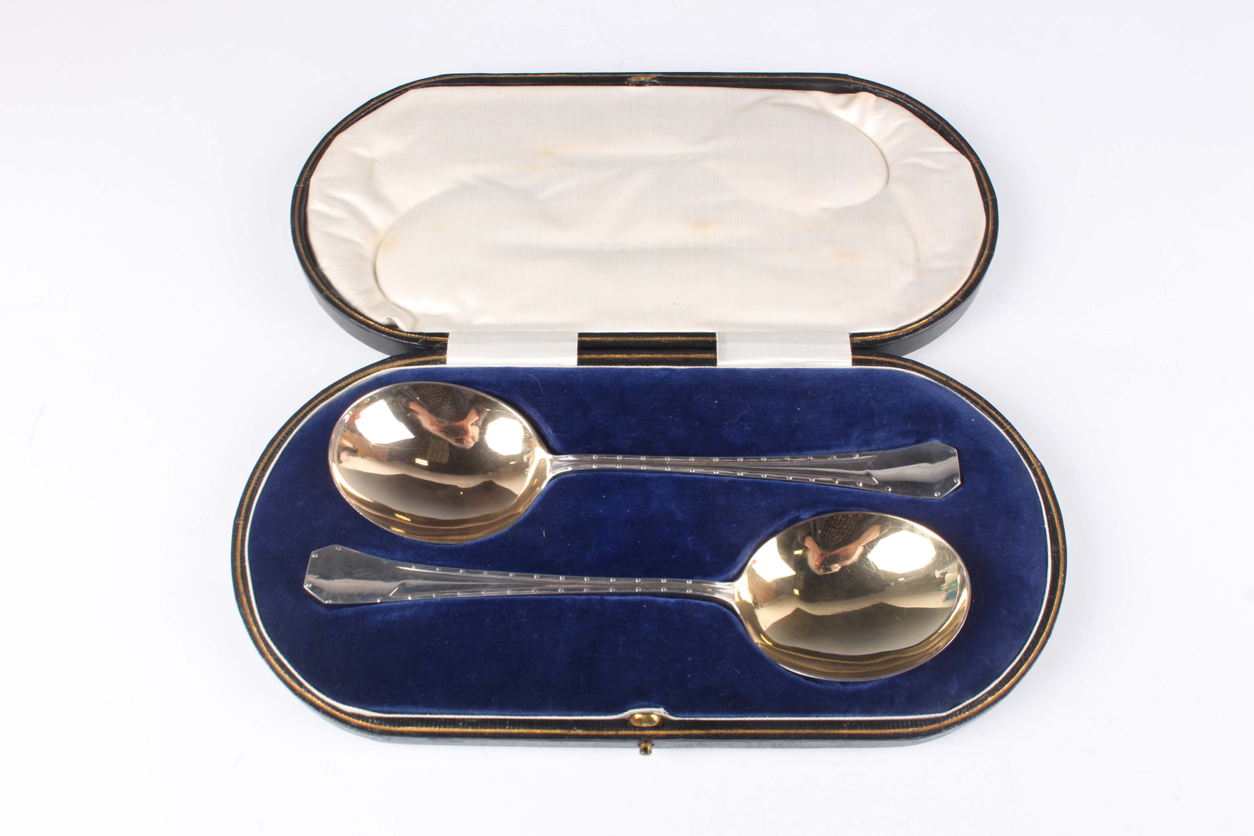 A pair of George V silver serving spoons, each gilt bowl with tapering and beaded handle, Sheffield 1922 and 1926 by Lee & Wigfull, total weight 143.6g, cased.