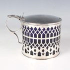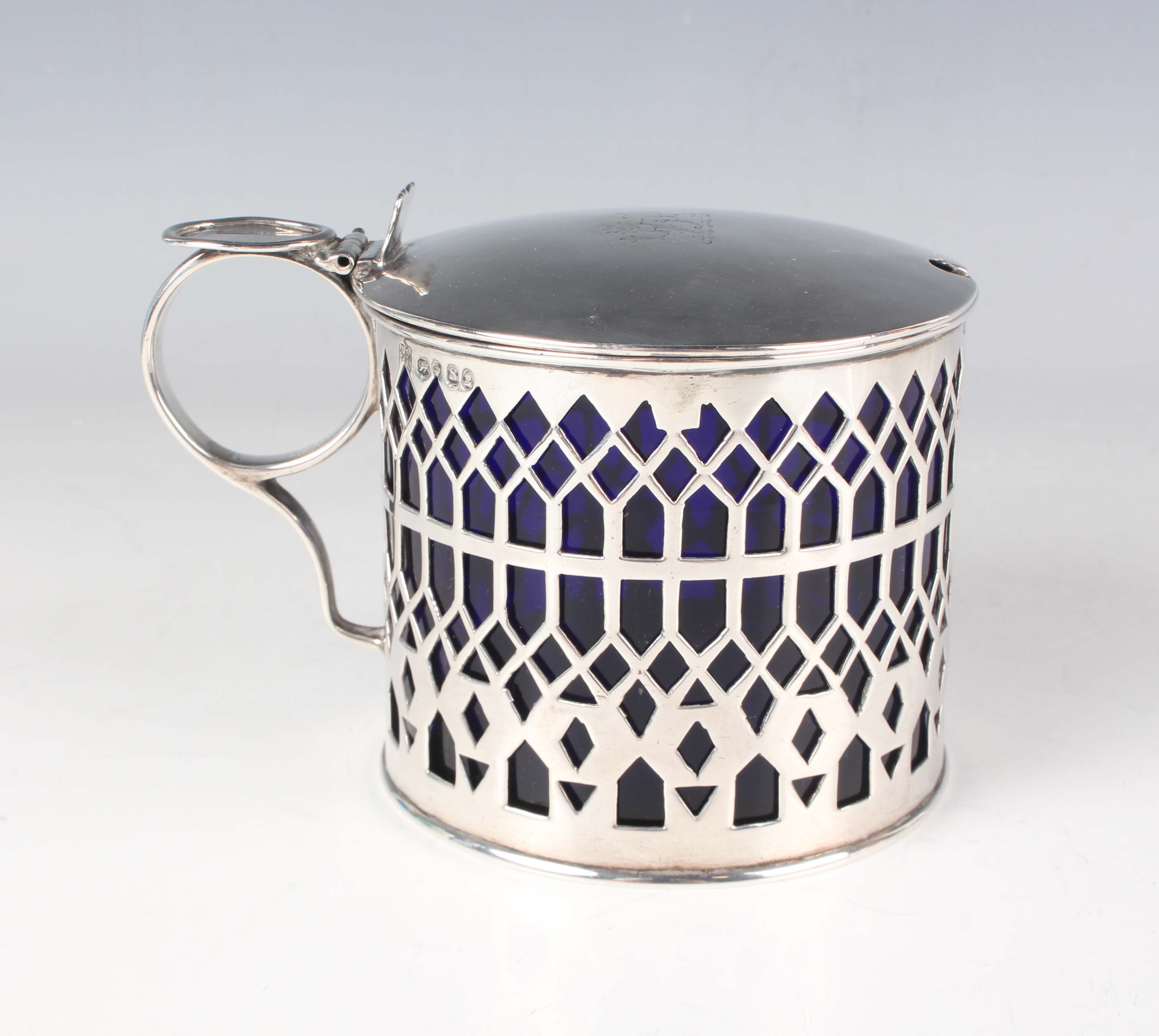 A William IV large silver mustard of cylindrical form with slightly domed crest engraved hinged lid above pierced sides, flanked by a ring handle, London 1833 by Joseph Angell I & John Angell I, weight 211.3g, height 9.5cm.