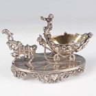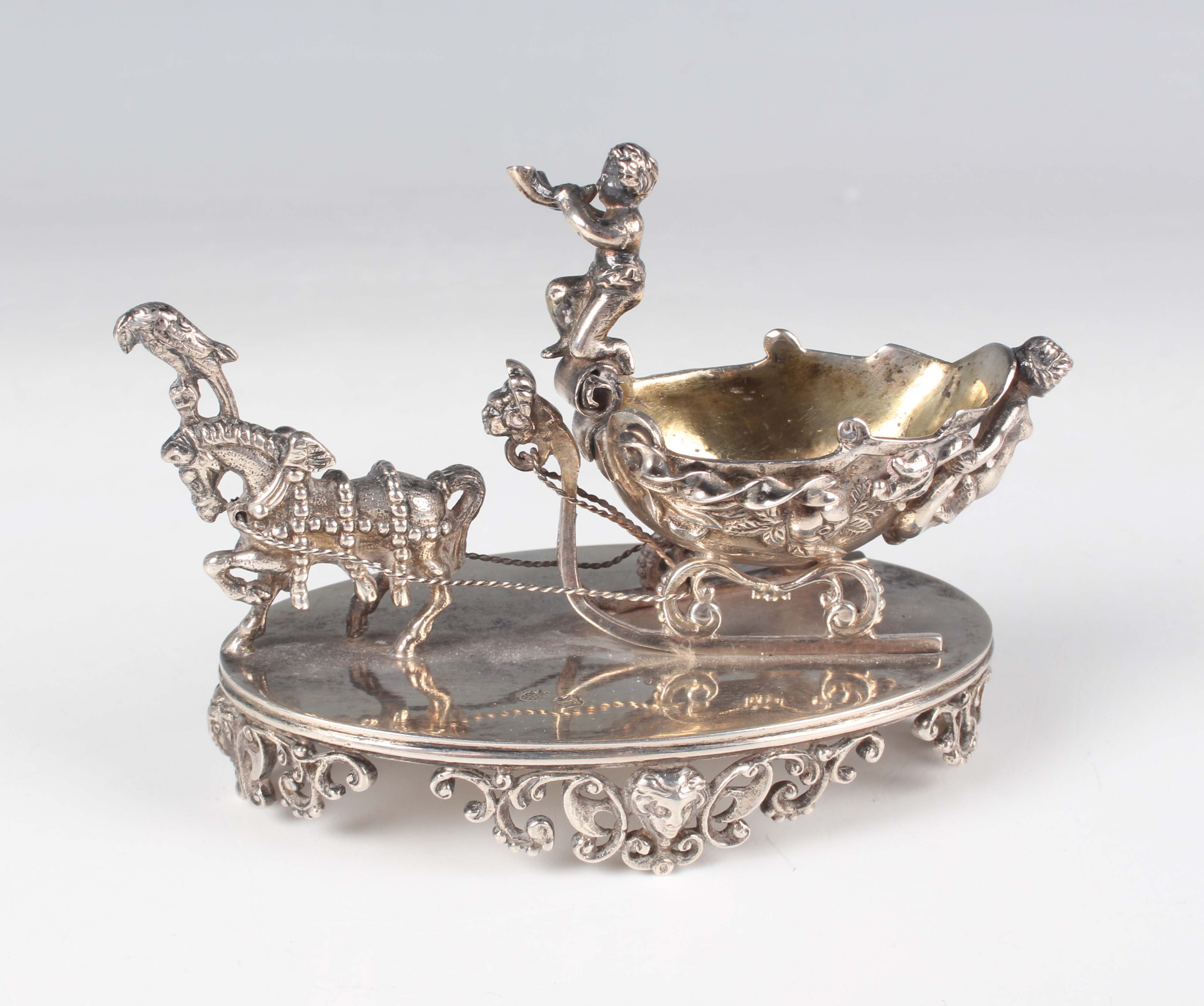 A late 19th century German silver salt in the form of a cherub seated on a horsedrawn sleigh, on an oval base raised on cast and pierced mask and scroll feet, weight 140.3g, length 10.5cm.