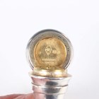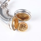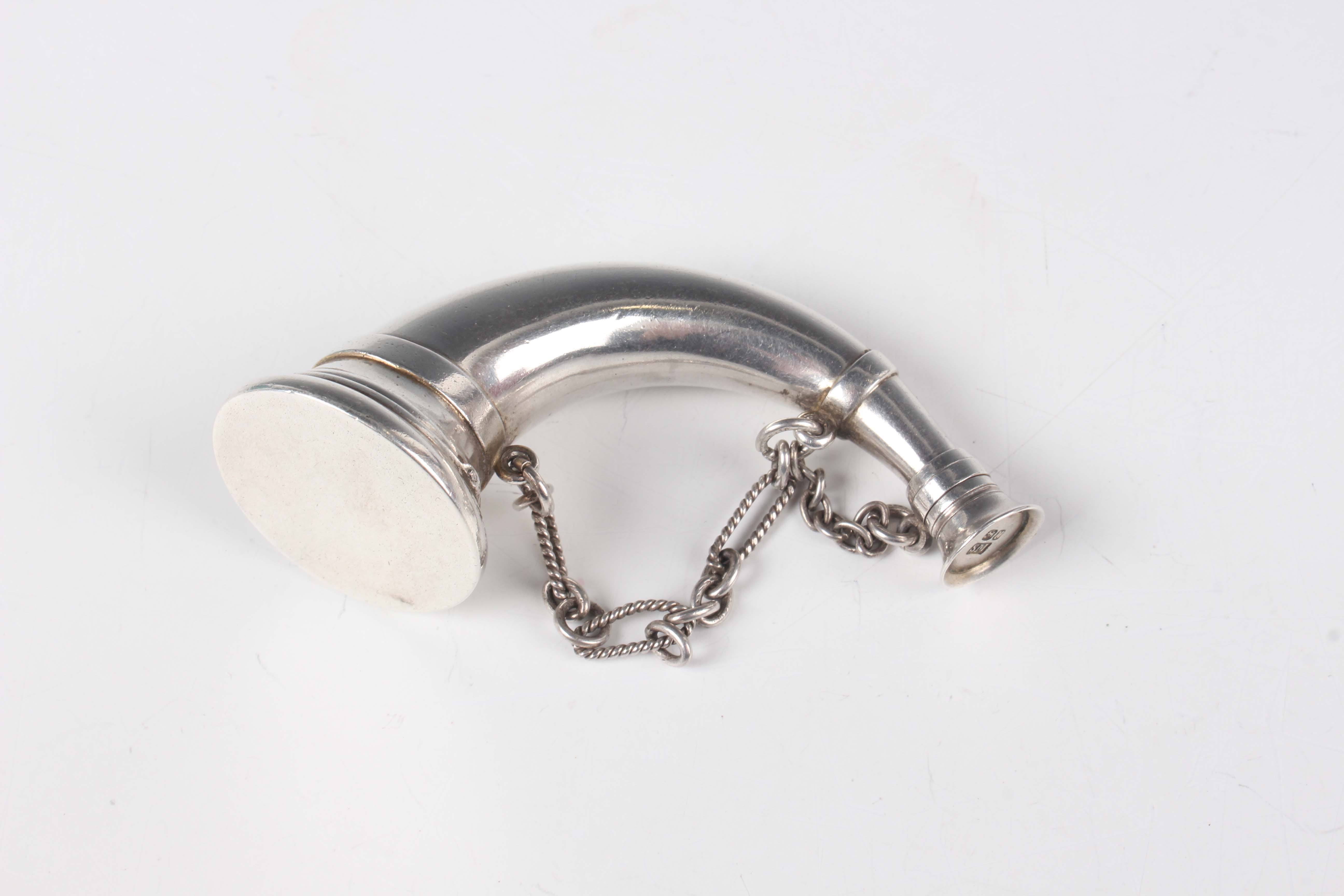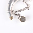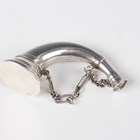 A Victorian silver combination vinaigrette and scent bottle in the form of a horn, one end with hinged lid revealing a gilt hinged grille, pierced and engraved with foliate scrolls, the opposing end with screw cover, fitted with a suspension chain, London 1872 by Sampson Mordan & Co, weight 34.4g, length 7.7cm.