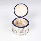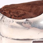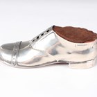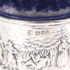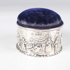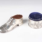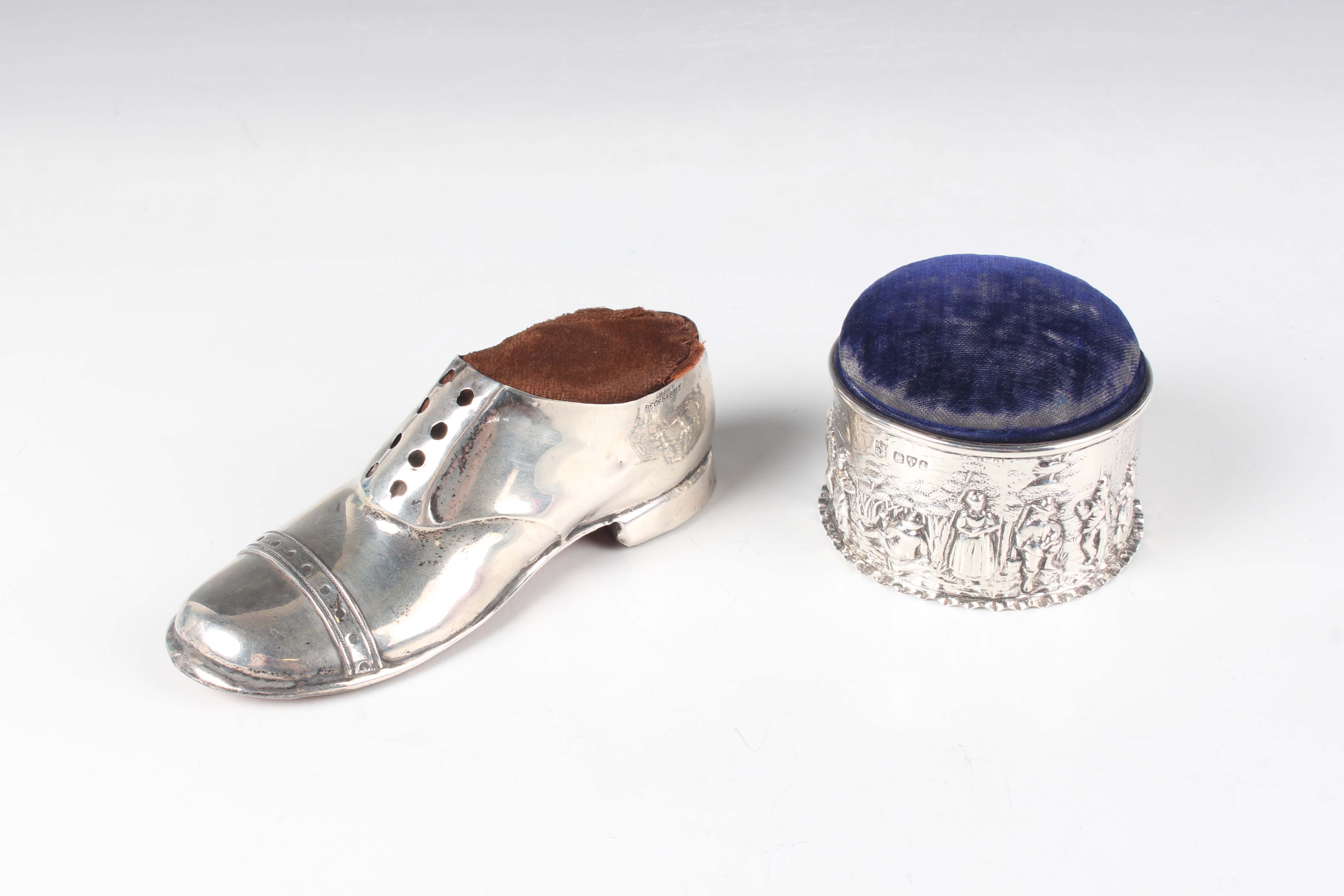 An Edwardian silver mounted circular pin cushion, the sides embossed with a continuous scene of figures, trees and buildings, Chester 1905 by George Nathan & Ridley Hayes, weight 37.1g, fitted with a blue velvet covered liner with padded hinged lid, total height 5.5cm, and a silver novelty pin cushion in the form of a shoe, Chester 1912 by S. Blanckensee & Son Ltd, length 12.5cm.