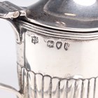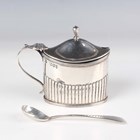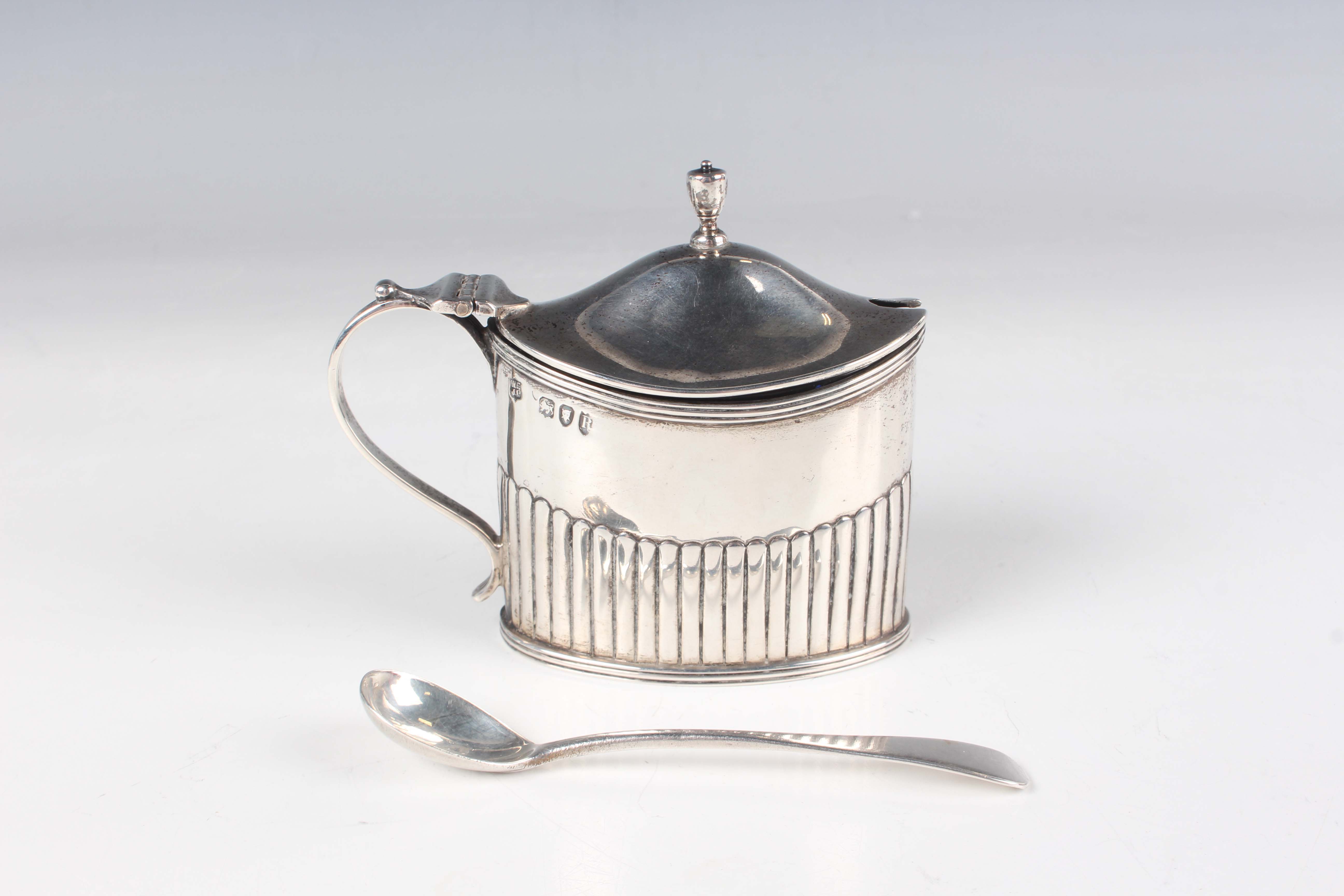 A late Victorian silver oval half-reeded mustard, the domed hinged lid with urn shaped finial, London 1892 by Goldsmiths & Silversmiths Co, height 8.3cm, and a silver mustard spoon, London 1894, total weight 99.6g.