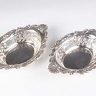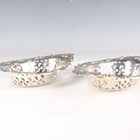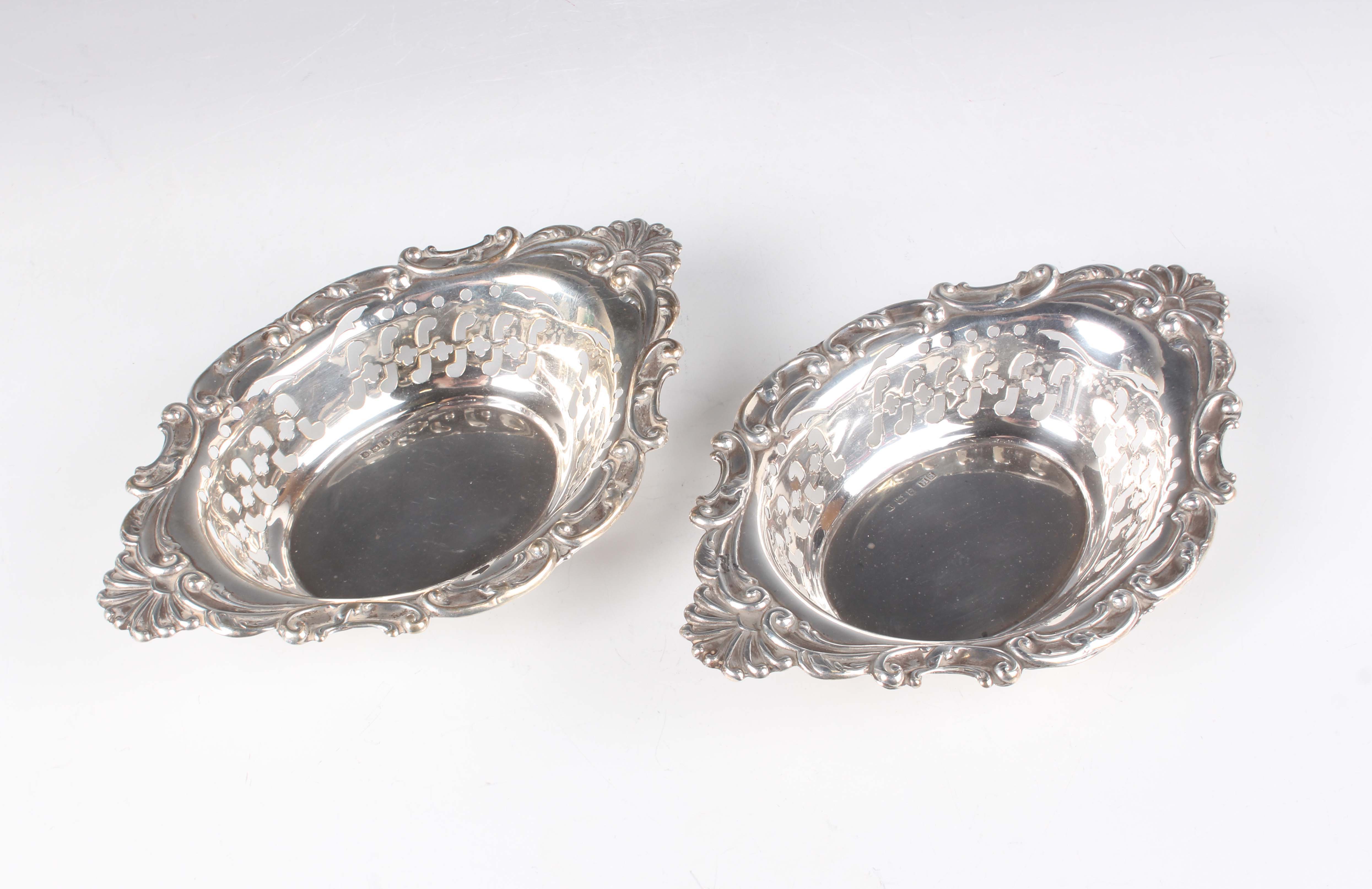 A pair of Edwardian silver oval bonbon dishes, each with pierced sides and embossed 'C' scroll rims, flanked by scallop shell handles, Birmingham 1909 and 1910 by Henry Matthews, total weight 152g, length 17.5cm.
