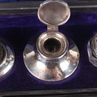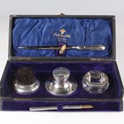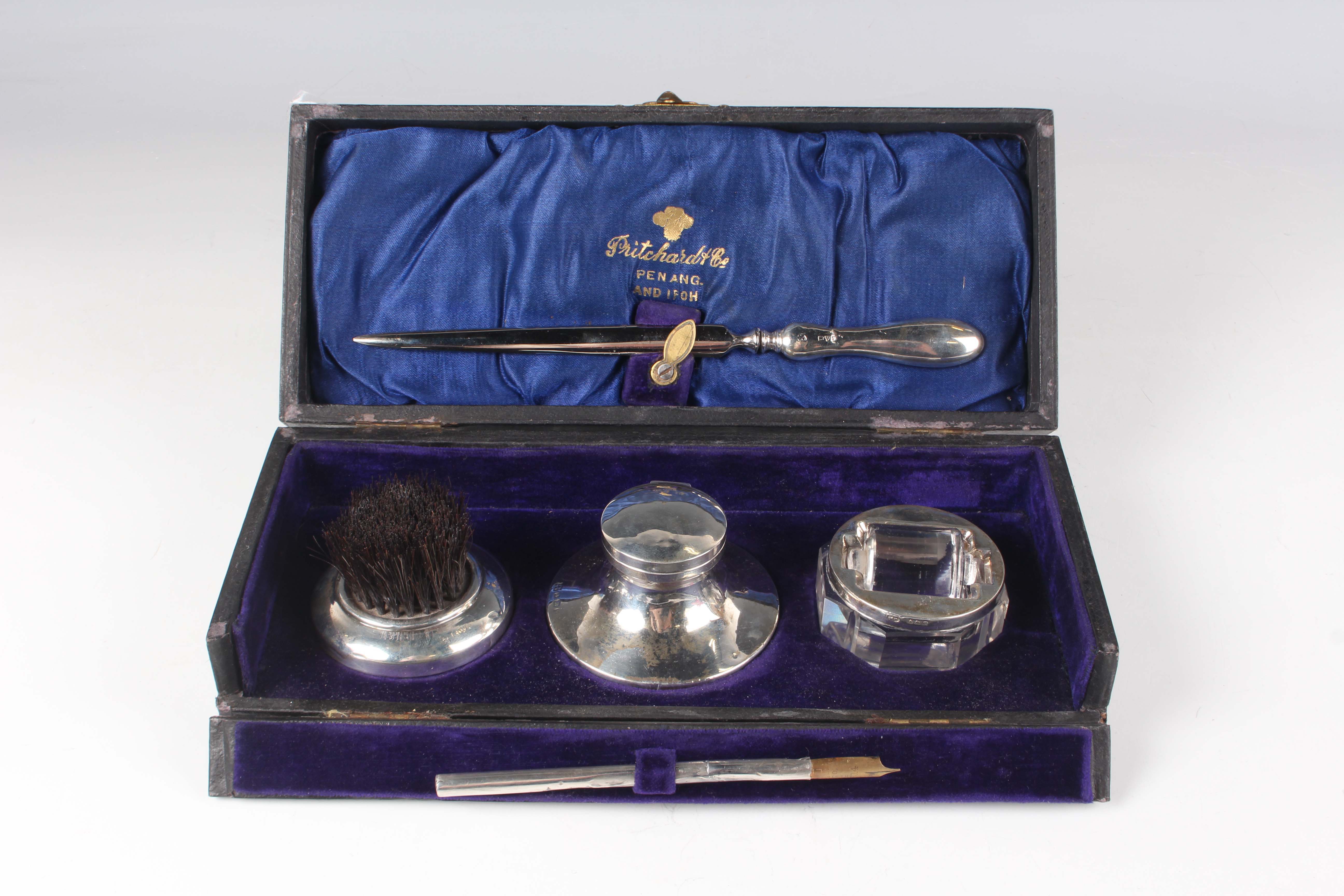 A George V silver mounted four-piece desk set, comprising circular capstan inkwell, nib wipe, stamp roller and paperknife, Chester 1911 and Birmingham 1915 by James Deakin & Sons, together with a silver dip pen, Birmingham 1911 by William Manton, cased.