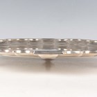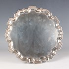 A George V silver card salver of circular form with piecrust rim, on scroll feet, London 1914 by Pairpoint Brothers, weight 719g, diameter 26cm.