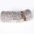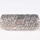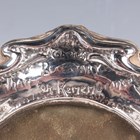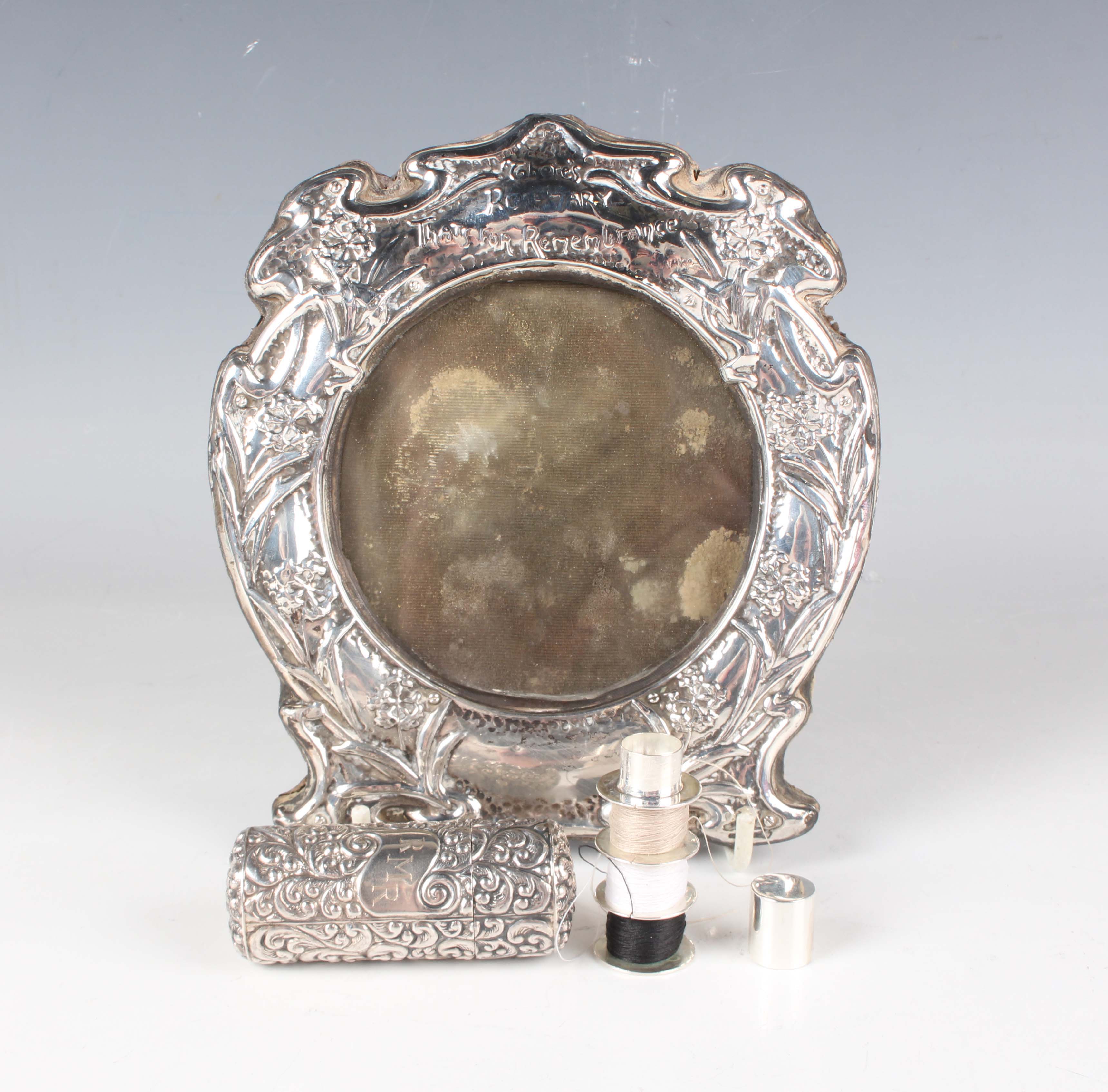 A late Victorian silver mounted shaped circular photograph frame, detailed 'There's Rosemary That's For Remembrance' within floral and foliate decoration, London 1899 by Henry Charles Freeman, height 16cm, and a .925 silver cotton spool case, decorated in relief with foliate scrolls, weight 29.8g, height 7cm, fitted with a three-cotton spool and needle case.