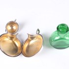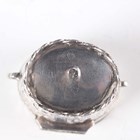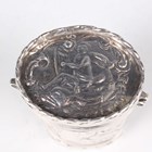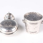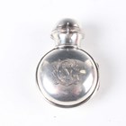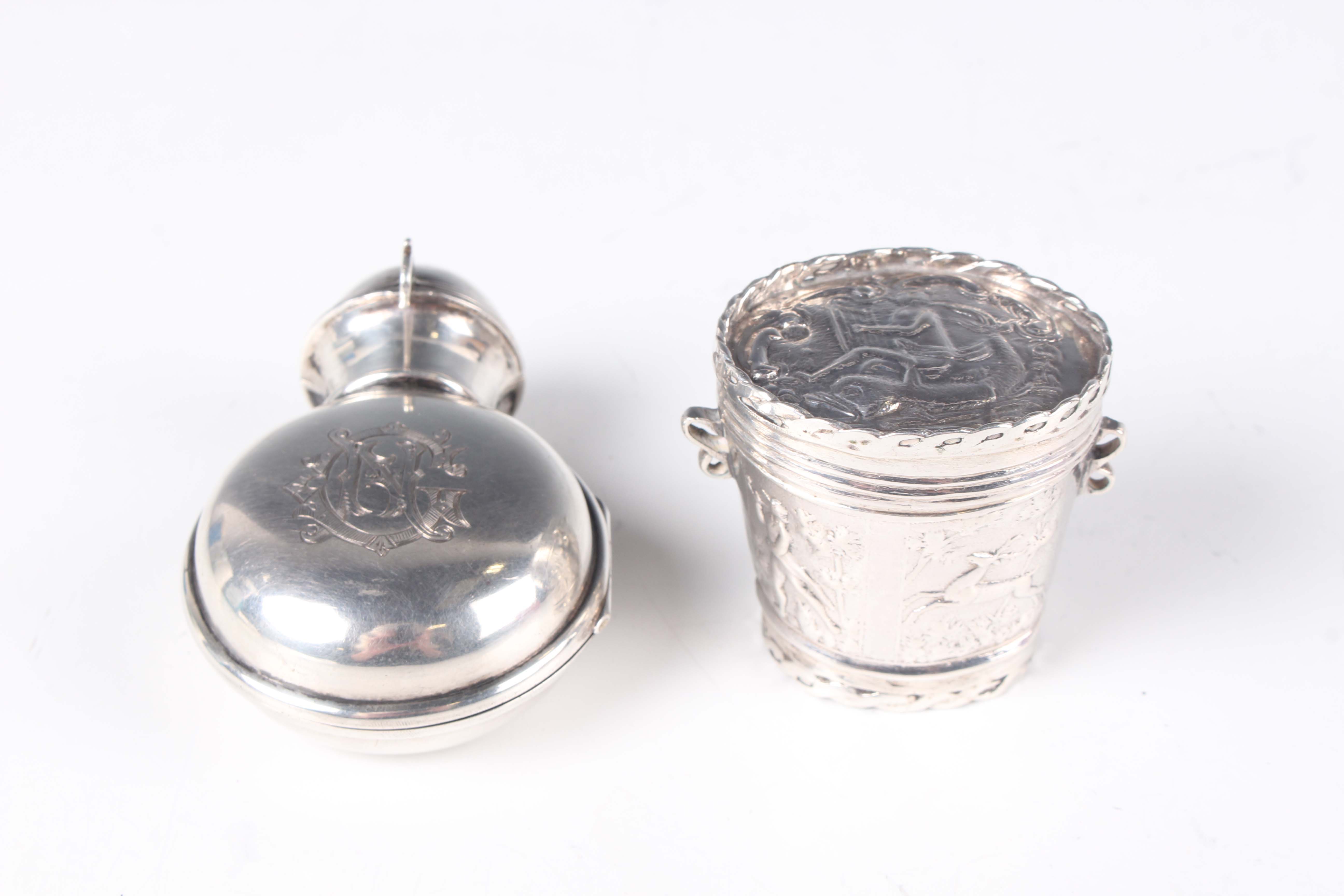 A late Victorian silver perfume bottle holder, the domed hinged lid above a flattened circular hinged body, monogram engraved, Birmingham 1897 by Synyer & Beddoes, weight 31.2g, height 6.8cm, fitted with a green glass perfume bottle and stopper (stopper chipped), together with a late 19th century Dutch silver cachou box of tapering oval form with hinged lid, decorated in relief with a hunting scene, weight 33.5g, height 4.3cm.