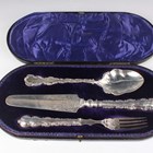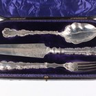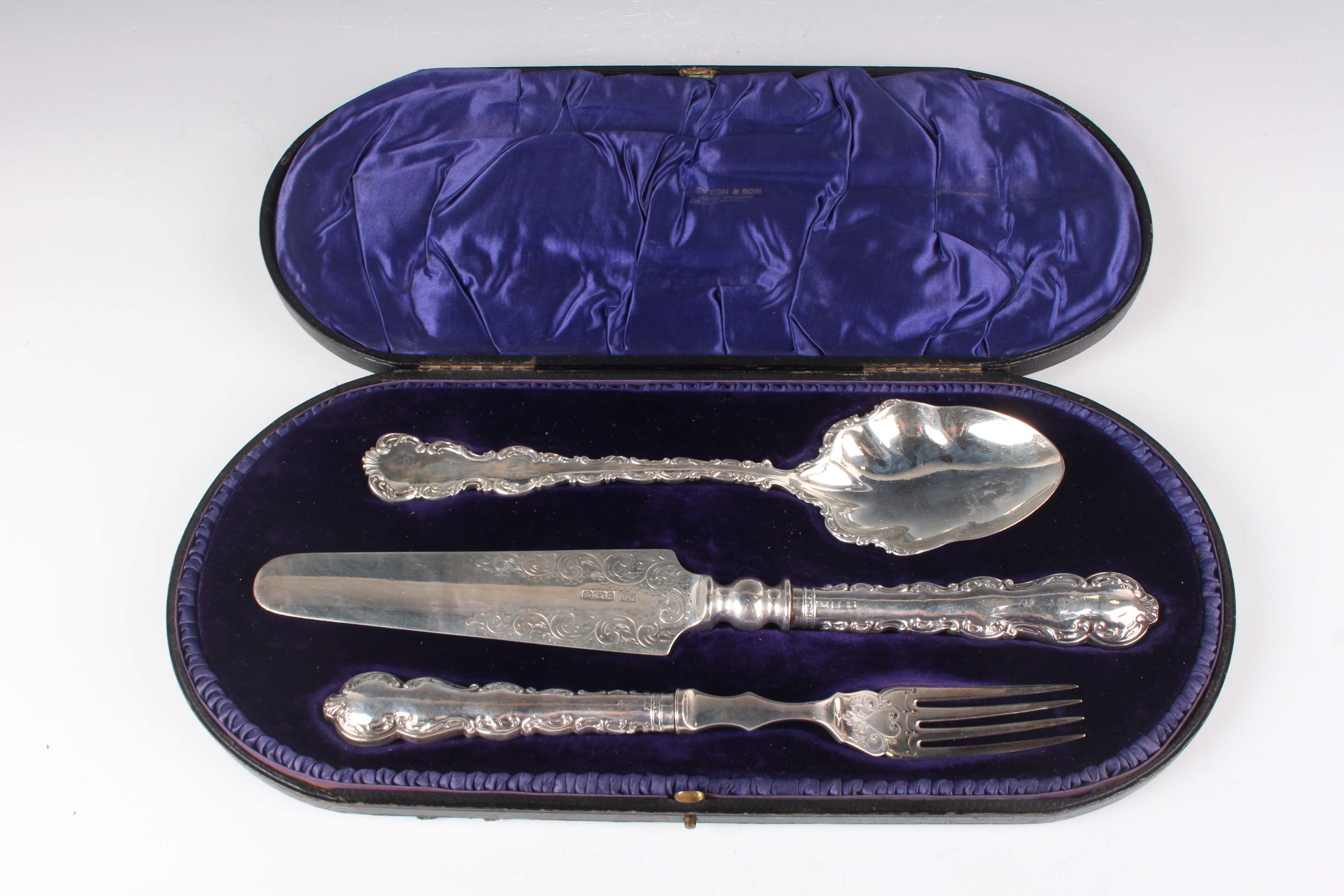 An Edwardian silver three-piece serving set, comprising slice, fork and spoon, each with scroll edged handle, Sheffield 1902 by Henry Wigfull, length of slice 28.5cm, cased.