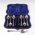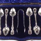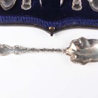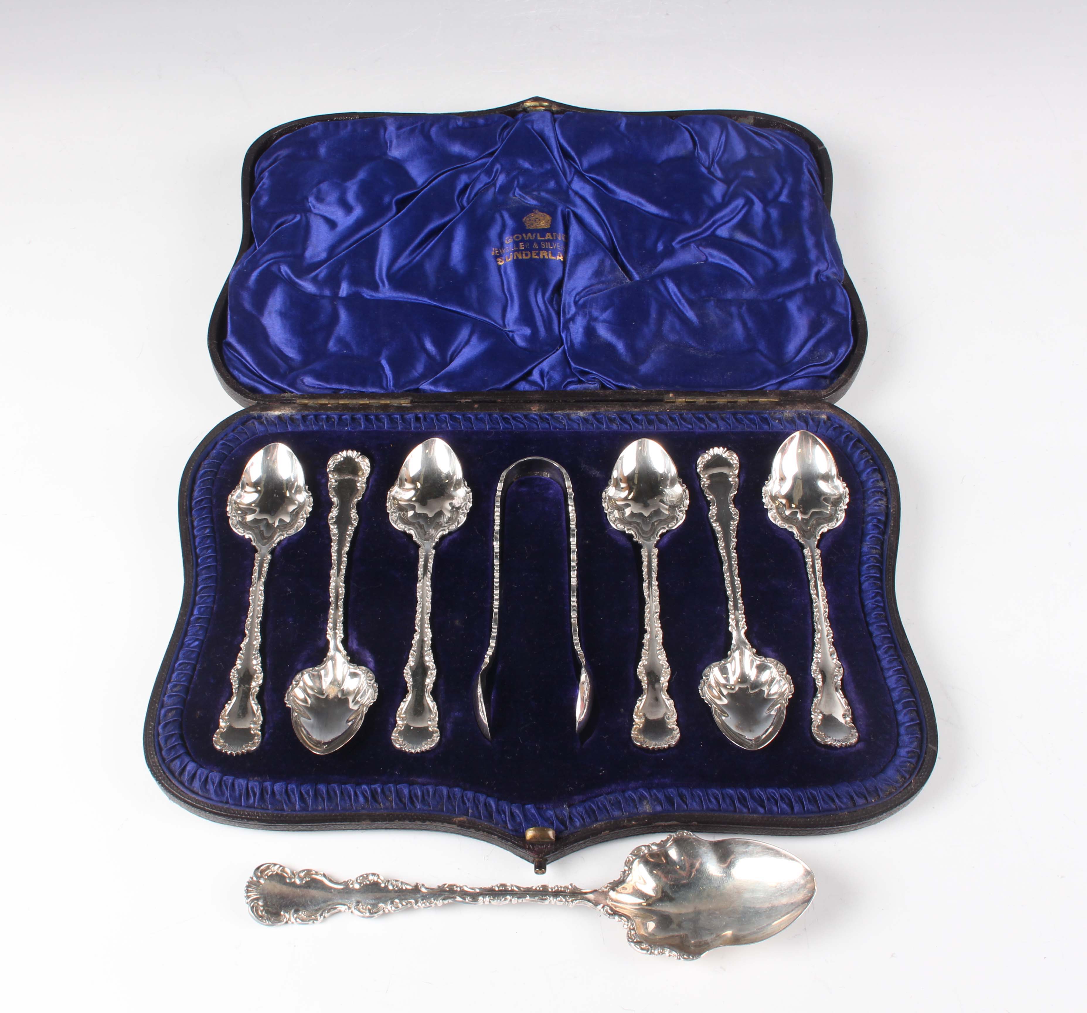 A set of six late Victorian silver teaspoons and pair of matching sugar tongs, each with scroll edged handle, Sheffield 1899 by Henry Wigfull, cased, together with a matching preserve spoon, Sheffield 1901 by Henry Wigfull, total weight 162.5g.