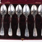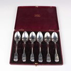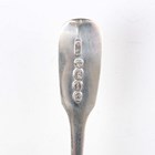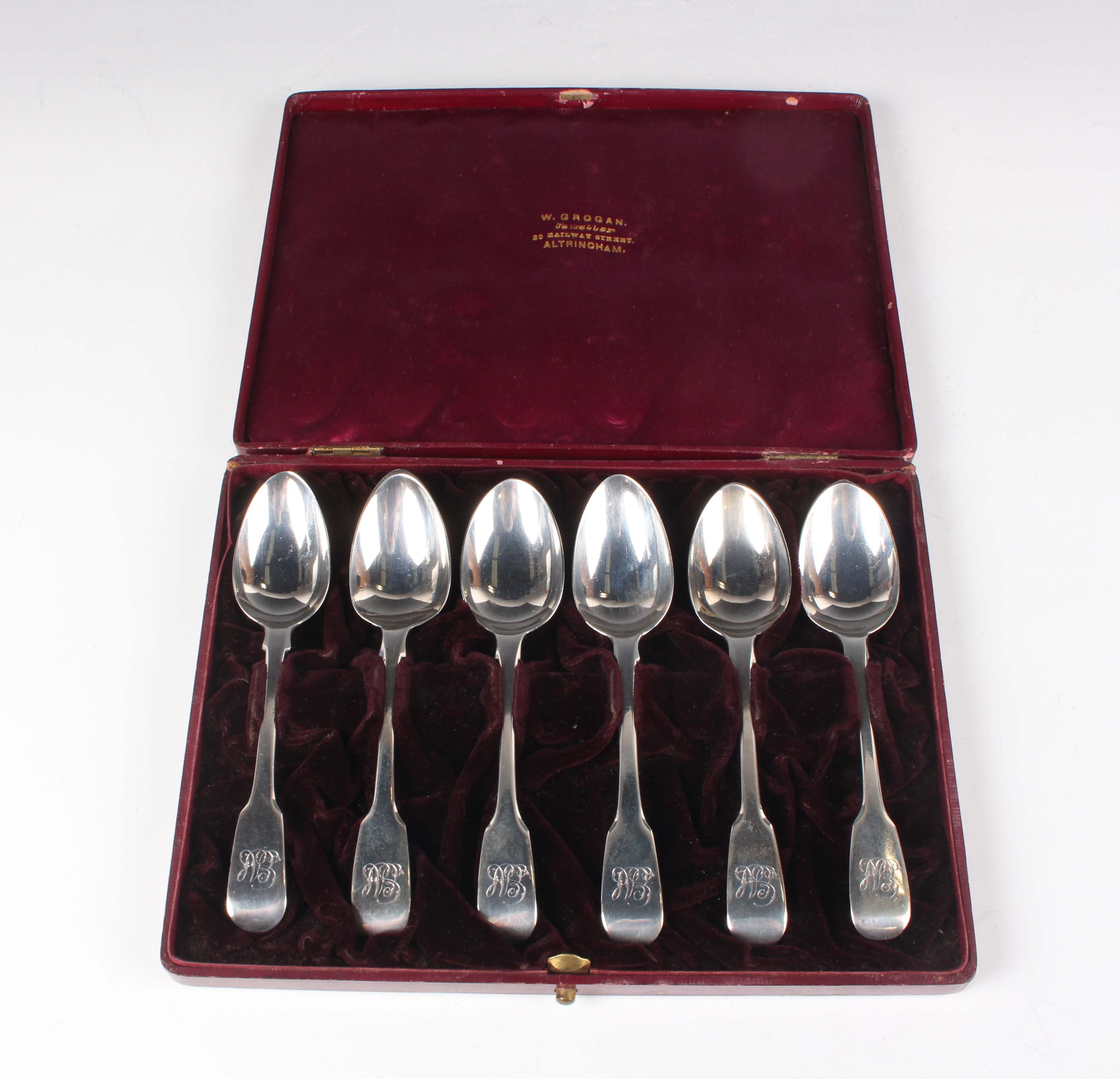 A harlequin set of six George III and later silver Fiddle pattern teaspoons, London 1815 by William Eley & William Fearn and London 1824 by John William Blake, weight 117g, length cased 13.5cm.