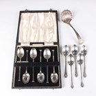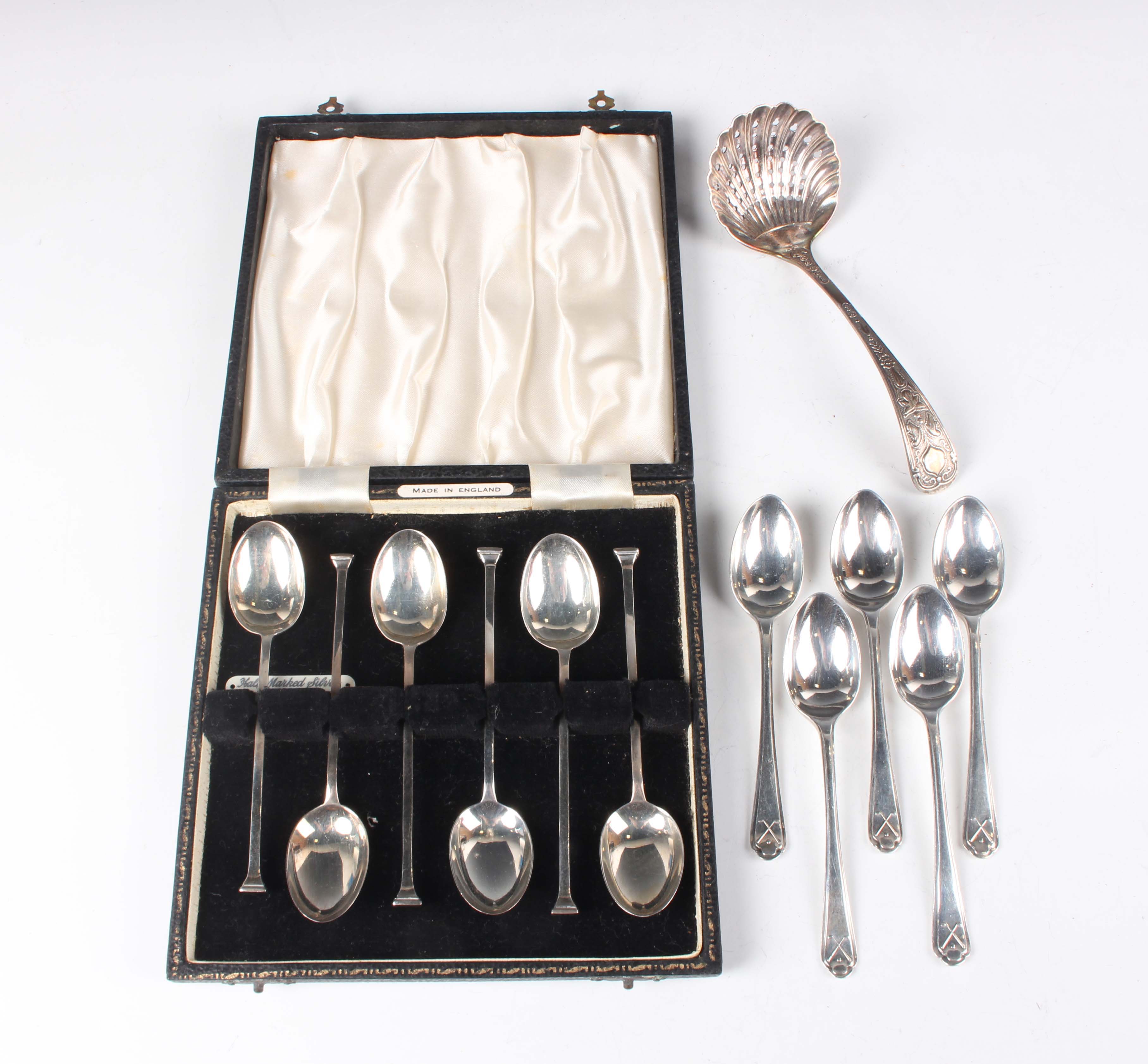A set of six George VI silver seal top coffee spoons, Sheffield 1939 by Cooper Brothers & Sons Ltd, cased, a silver sugar sifter spoon, Sheffield 1895, and five silver coffee spoons with golf terminals, Sheffield 1933, total weight 160.3g.