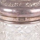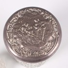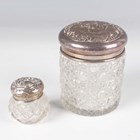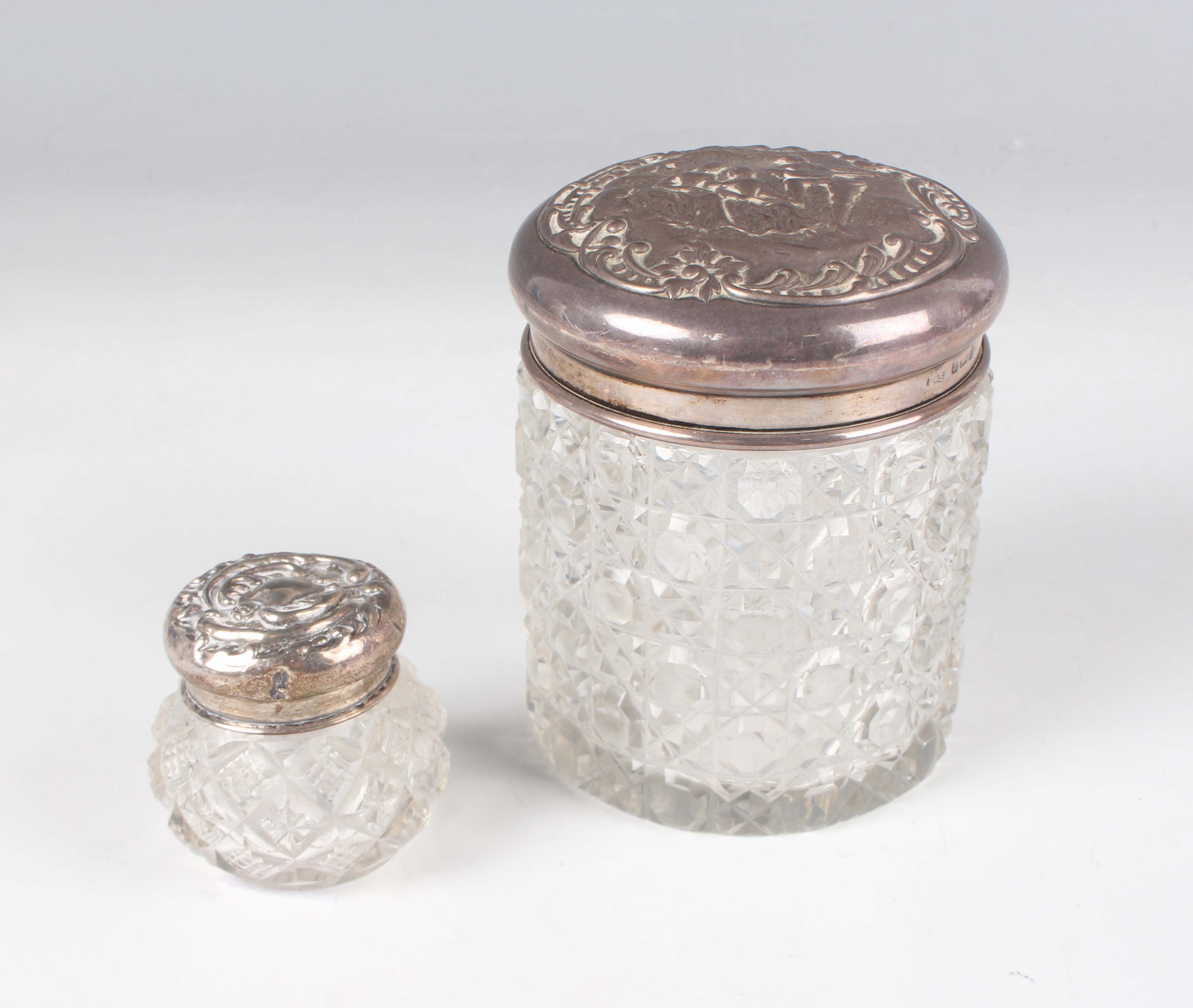An Edwardian silver and cut glass cylindrical dressing table jar, the slightly domed silver cover embossed with two young ladies accompanied by a musician, Birmingham 1904, height 9cm, and a similar smaller silver and cut glass jar, weight of both covers 39.6g.