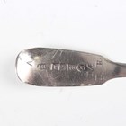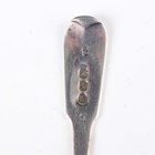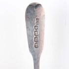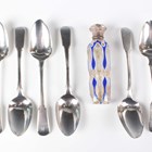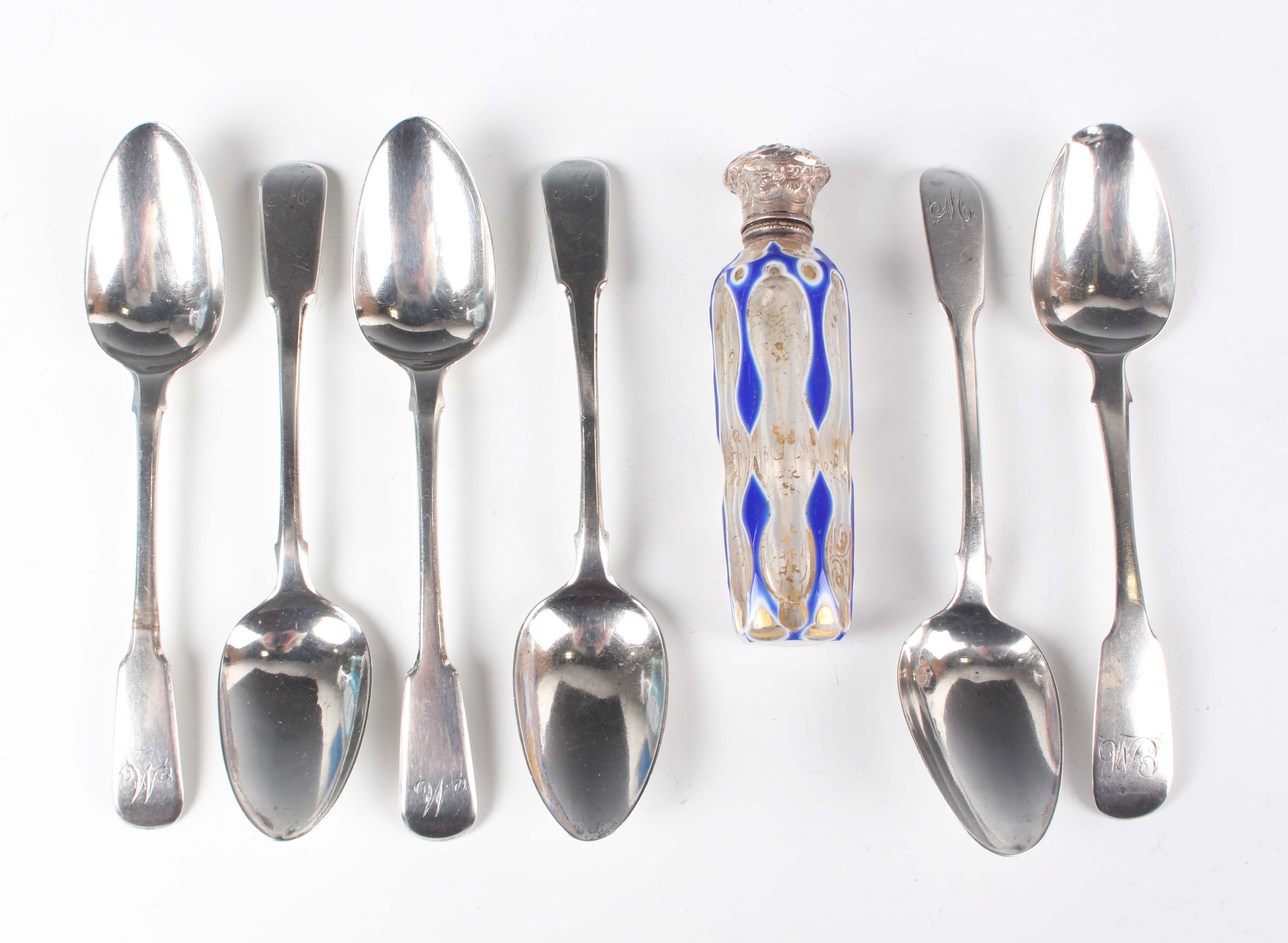 A set of four George III silver Fiddle pattern teaspoons, London 1810 by Joseph Ash I, and two other silver Fiddle pattern teaspoons, total weight 96.2g, together with a silver mounted blue and white flash overlay cut glass scent bottle with gilt detail, height 9.5cm.