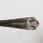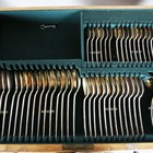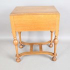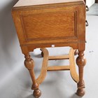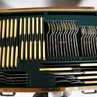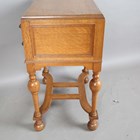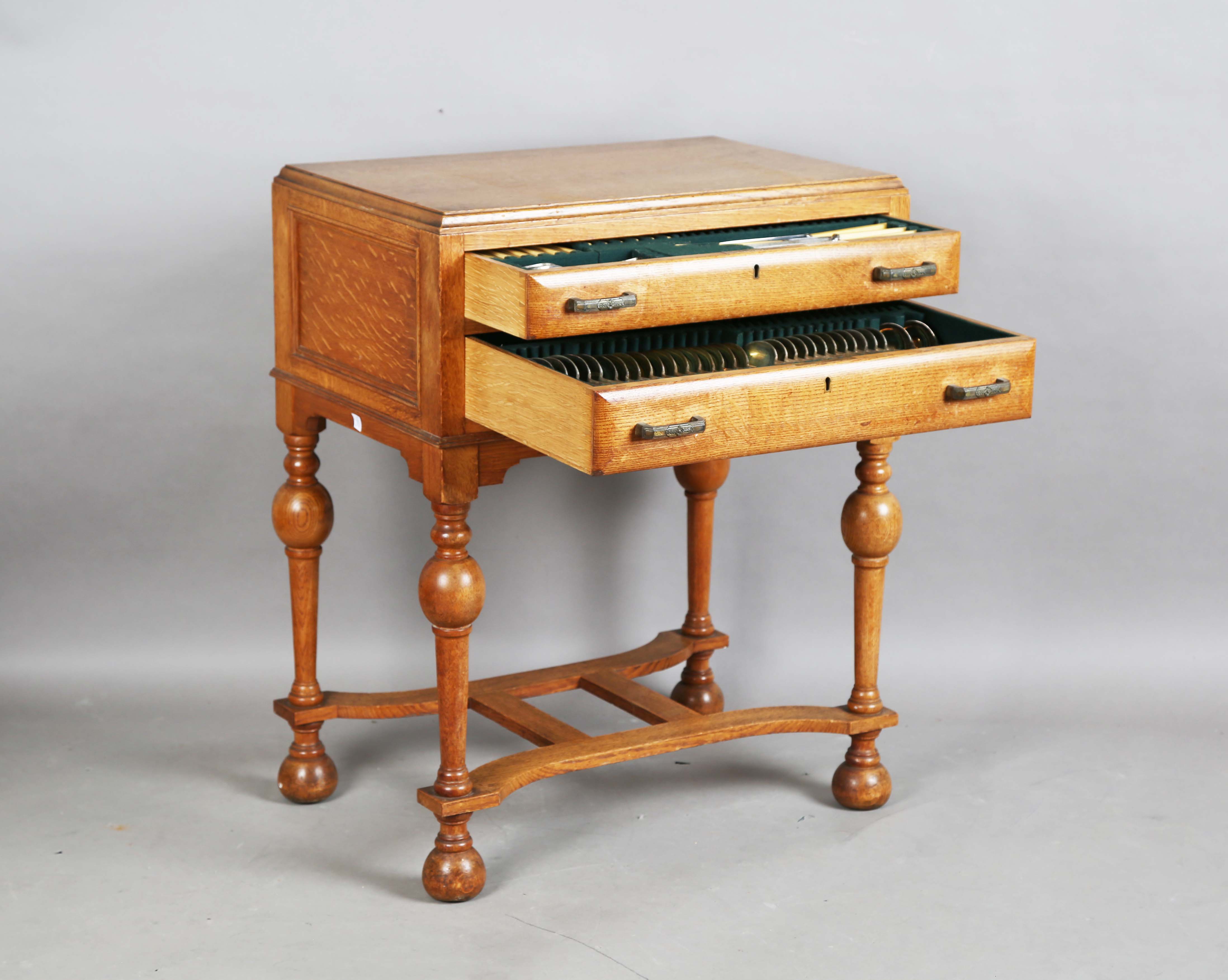 A part canteen of plated cutlery with foliate terminals and ribbon and reeded handles, comprising six tablespoons, twelve table forks, twelve soup spoons, twelve dessert forks and spoons, twelve teaspoons, six egg spoons, two sauce ladles, twelve table and dessert knives and a five-piece carving set, all with faux ivory handles, within a fitted Art Deco oak two-drawer canteen table, detailed 'Hamilton & Co Ltd', case width 62cm.