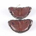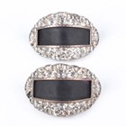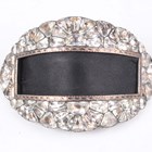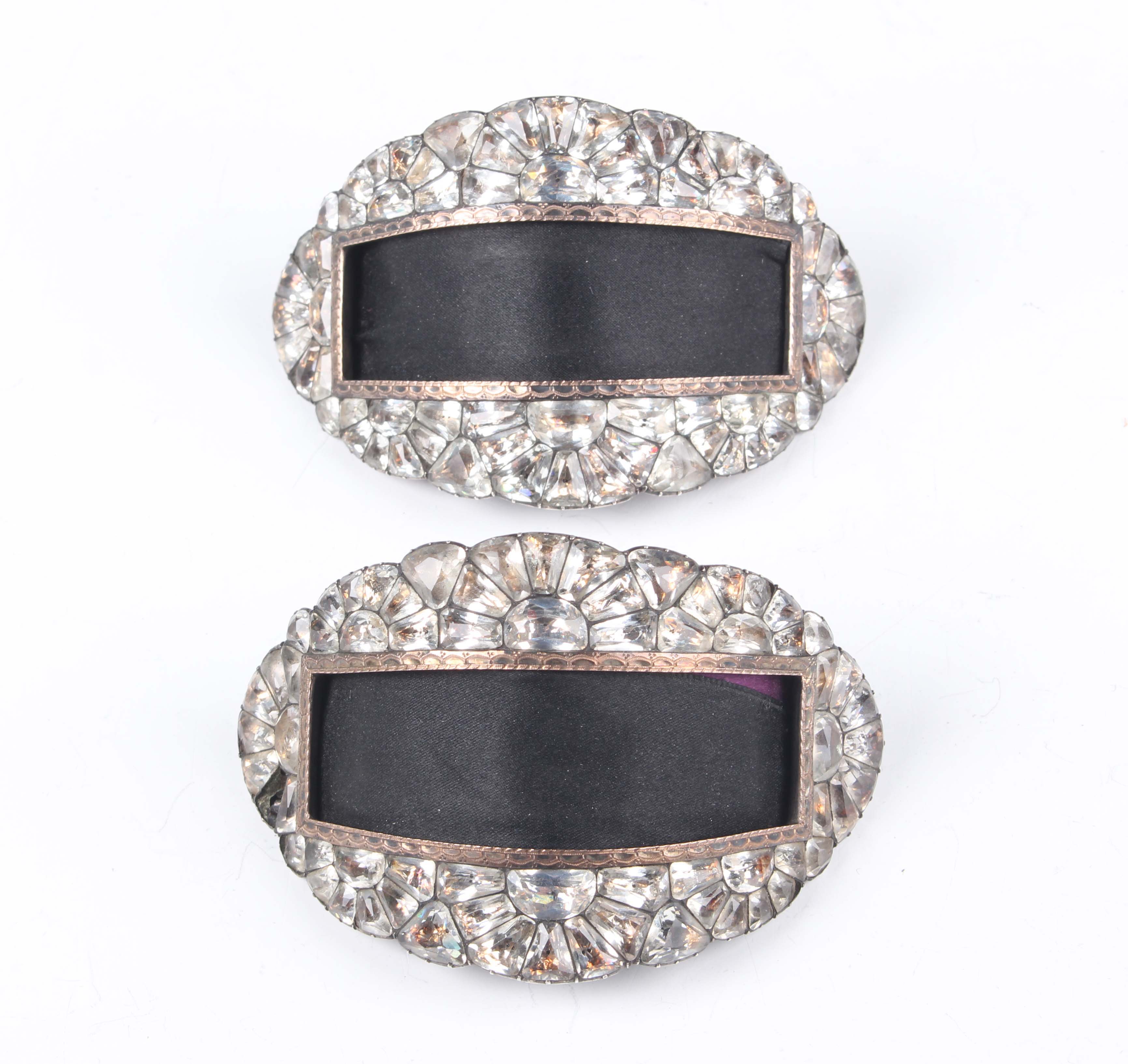 A pair of 18th century silver and gold finial backed colourless paste set curved oval shoe buckles with leather backs, unmarked, total weight 147.9g, length 8.2cm (one paste lacking).