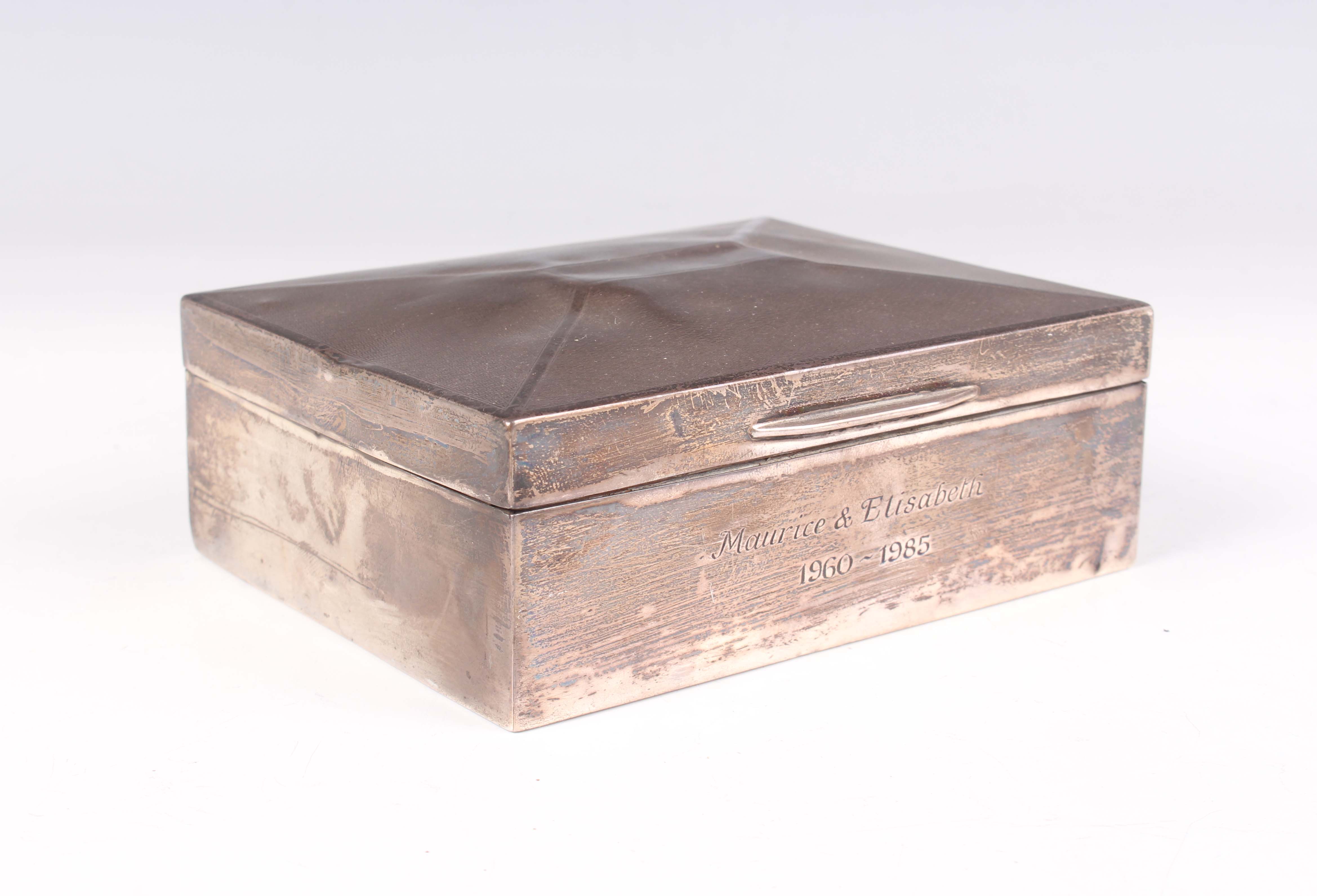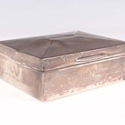 A George V silver rectangular cigarette box, the hinged lid with engine turned decoration, inscription engraved to the front, Birmingham 1931, length 11.5cm.