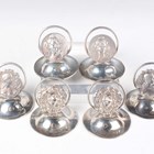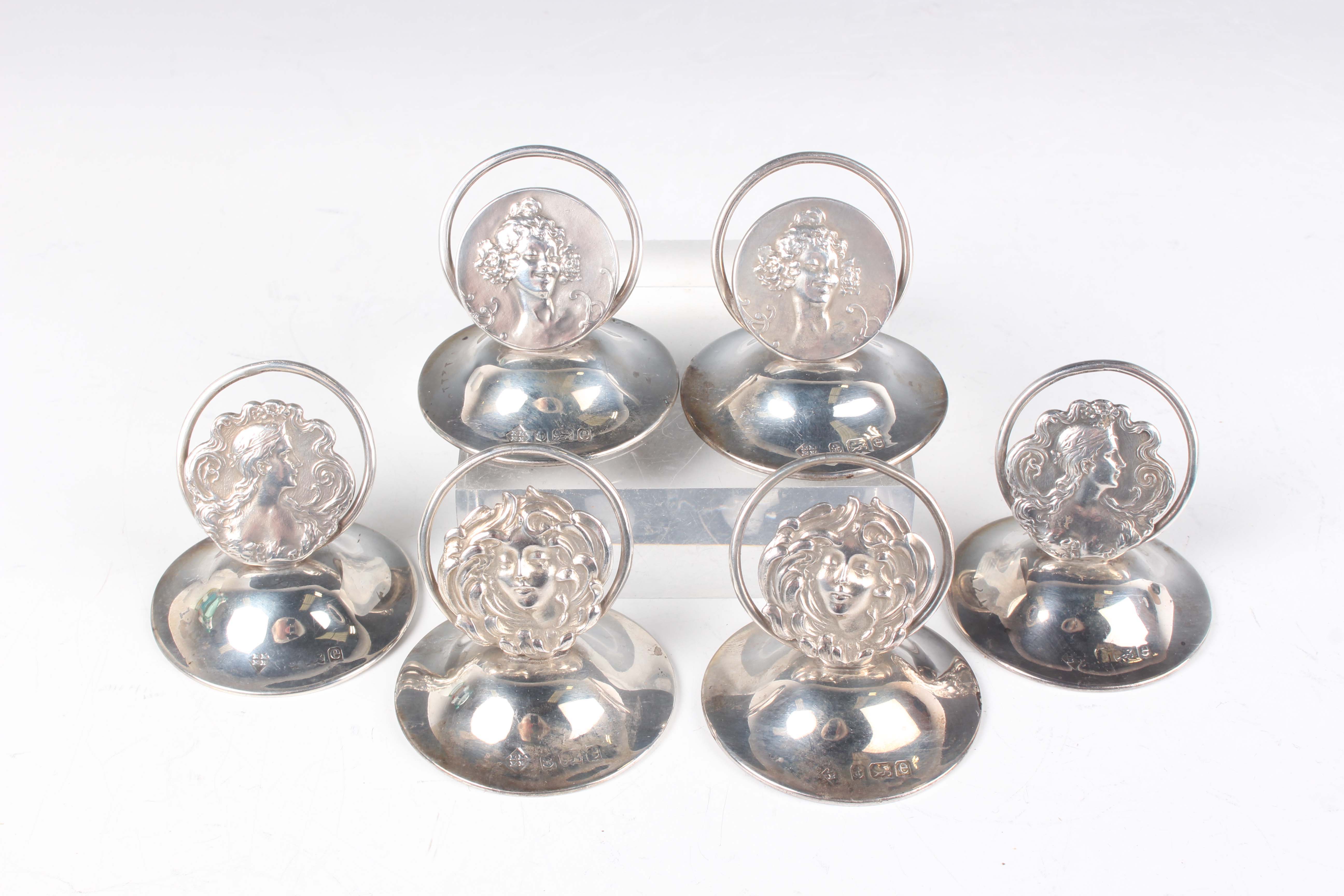A set of six Edwardian silver menu holders, each of disc form, decorated in relief with bust portraits of maidens with flowing hair, on a slightly domed circular base, Birmingham 1904 by Martin, Hall & Co, total weight 133.4g, height 3.7cm.