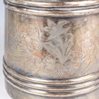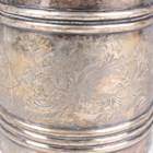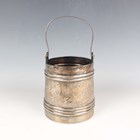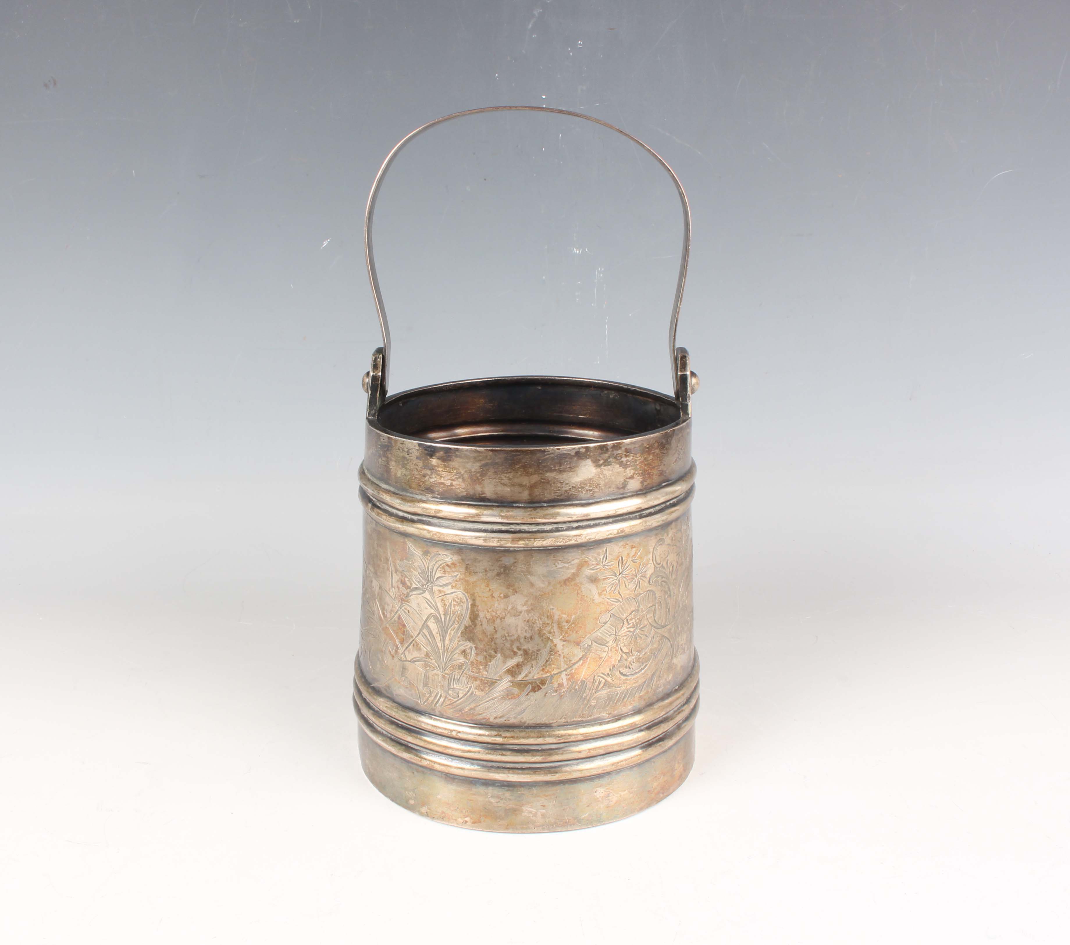 A late 19th/early 20th century Russian silver ice bucket, 84 zolotnik, of tapering cylindrical coopered bucket form with swing handle, the front engraved with a scrolling ribbon banner and flowers between reeded bands, makers mark TP, weight 614g, total weight 25cm, together with a pair of plated ice tongs.