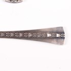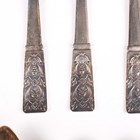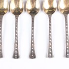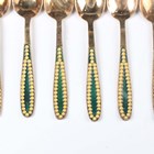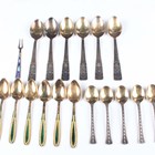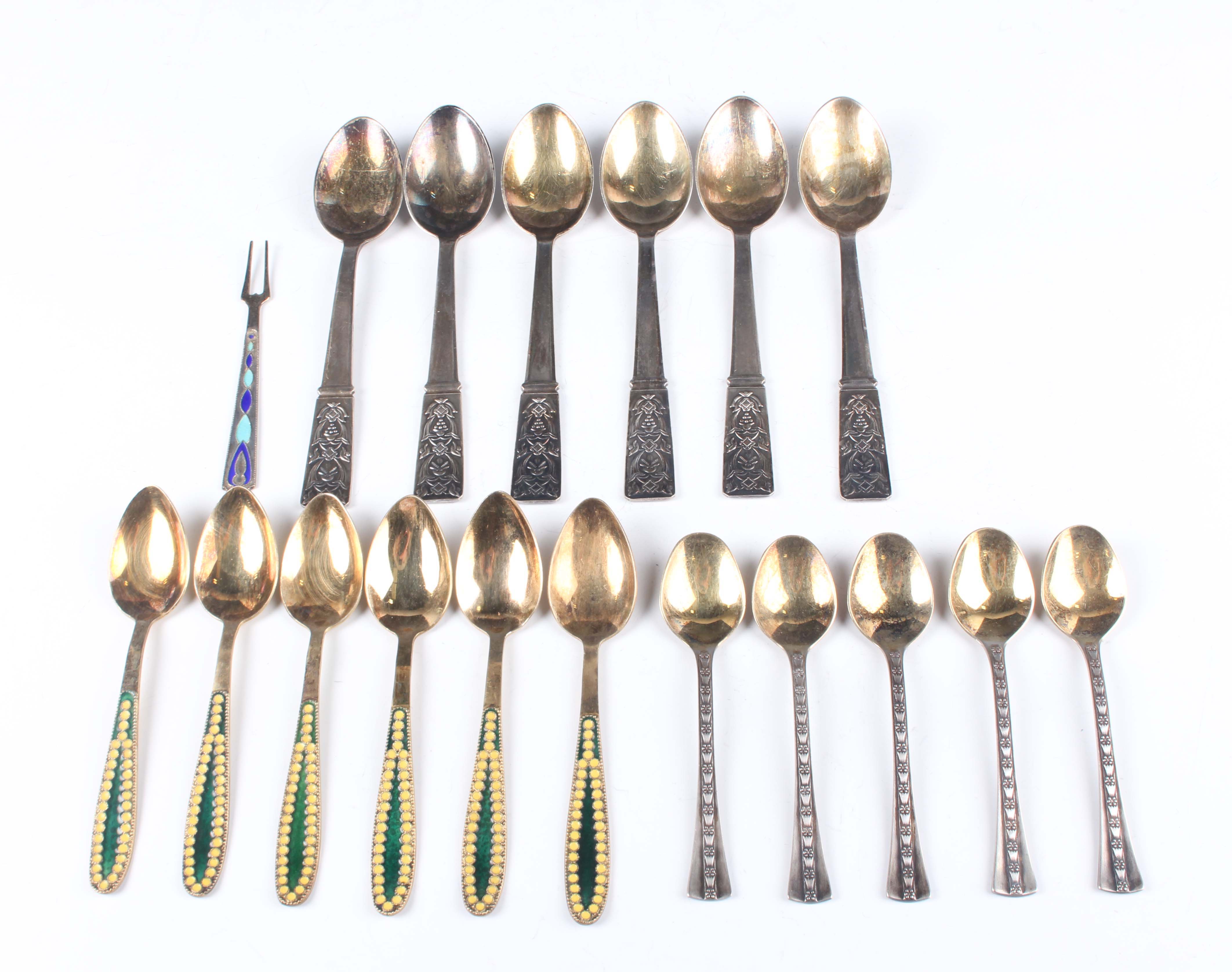 A set of six 20th century Russian silver teaspoons, each tapering handle cast with flowers and scrolls, detailed '875', and a silver and enamelled pickle fork, detailed '875', total weight 173.6g, together with a set of six Russian silver gilt and enamelled teaspoons, each handle enamelled in green and yellow, detailed '816', and a set of five Russian silver coffee spoons, each handle cast with bellflowers, detailed '816', total weight 156.7g.