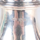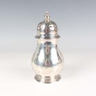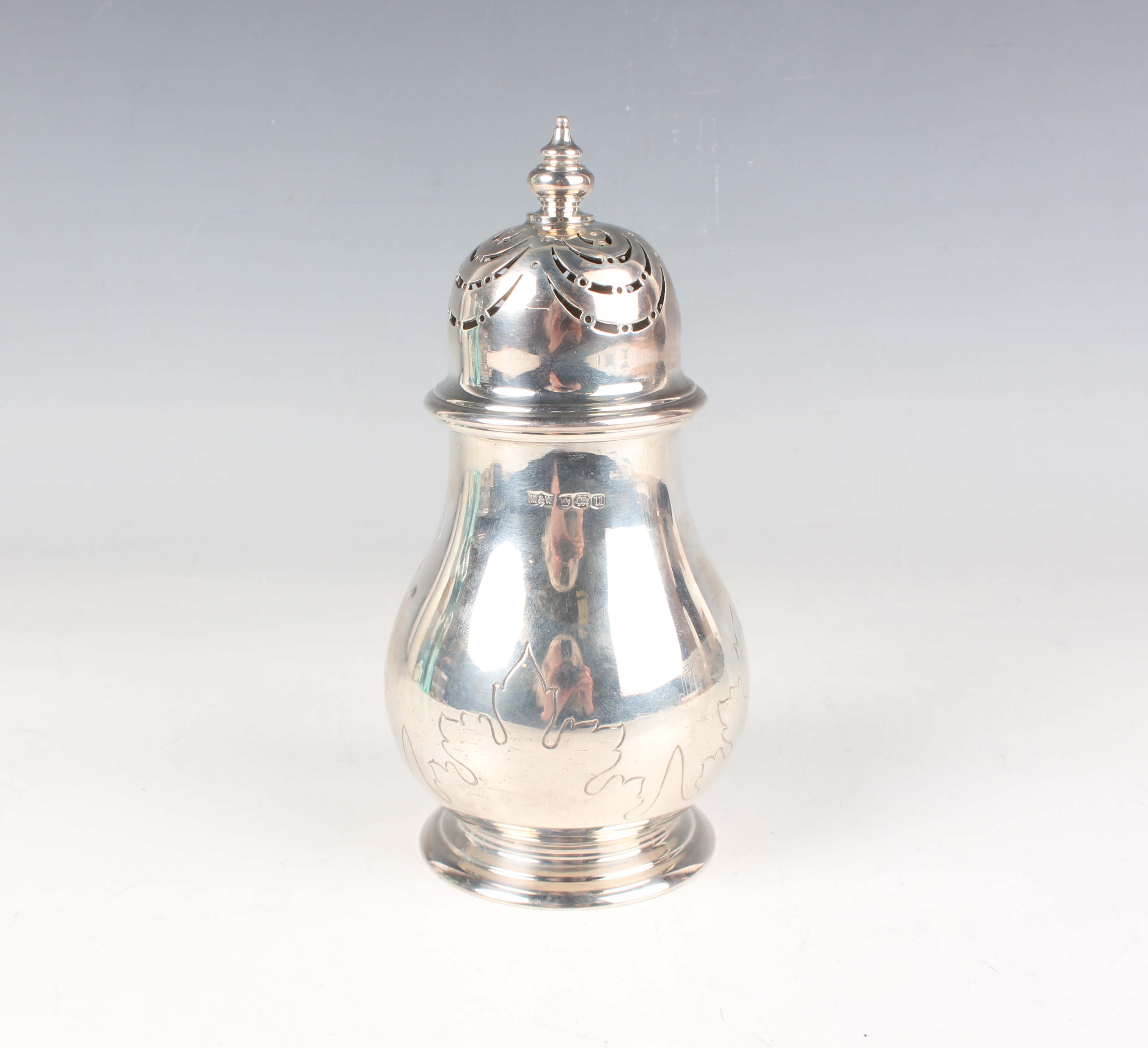A George VI silver sugar caster of baluster form with pierced domed cover and knop finial above a band of engraved leaves, on a circular foot, Sheffield 1937 by Mappin & Webb Ltd, weight 228g, height 16cm.