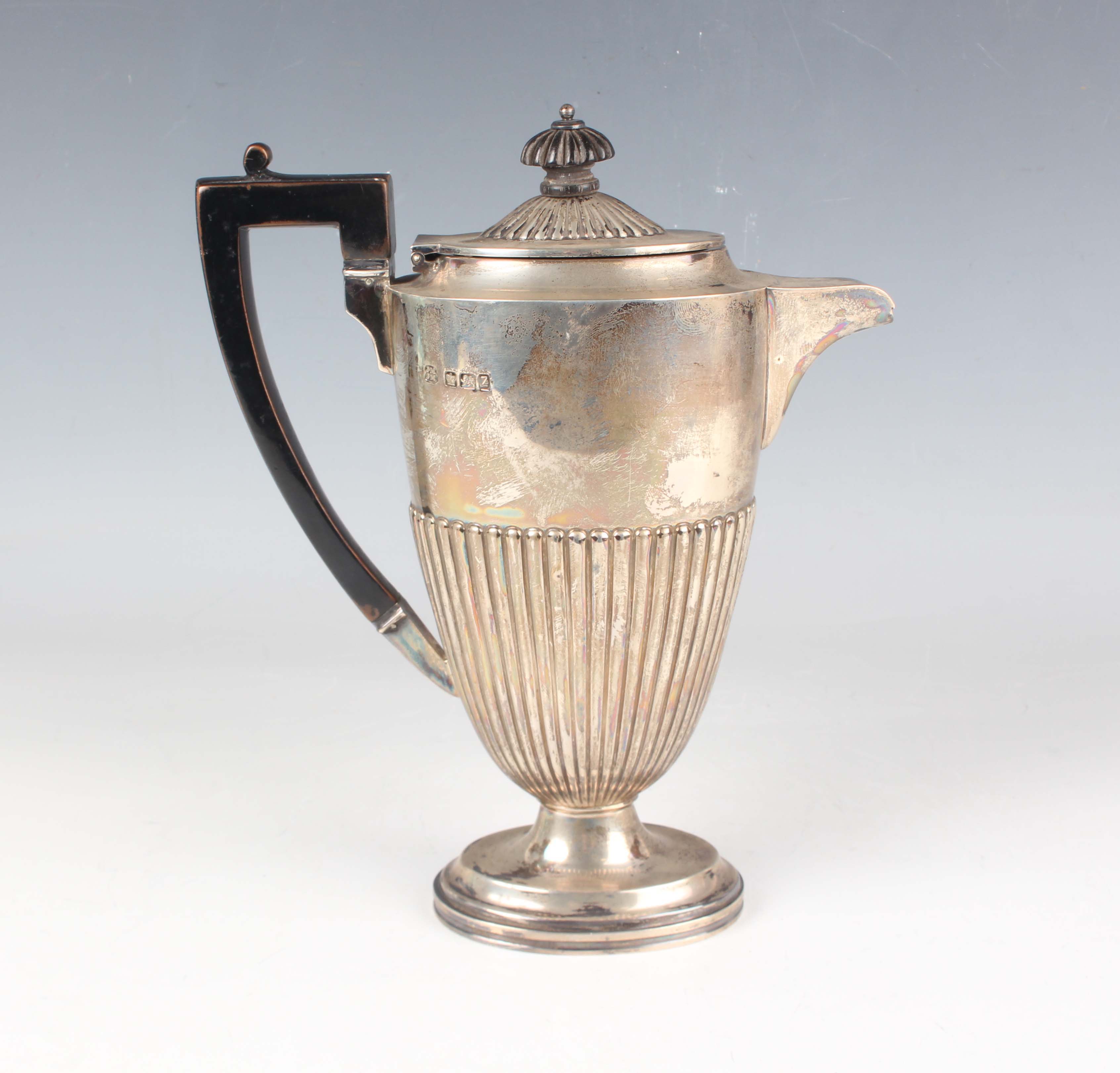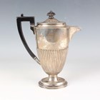 A late Victorian silver hot water pot of oval half-reeded form on a stepped foot, Sheffield 1892 by JM JM, width 404.4g, height 21.5cm.