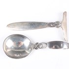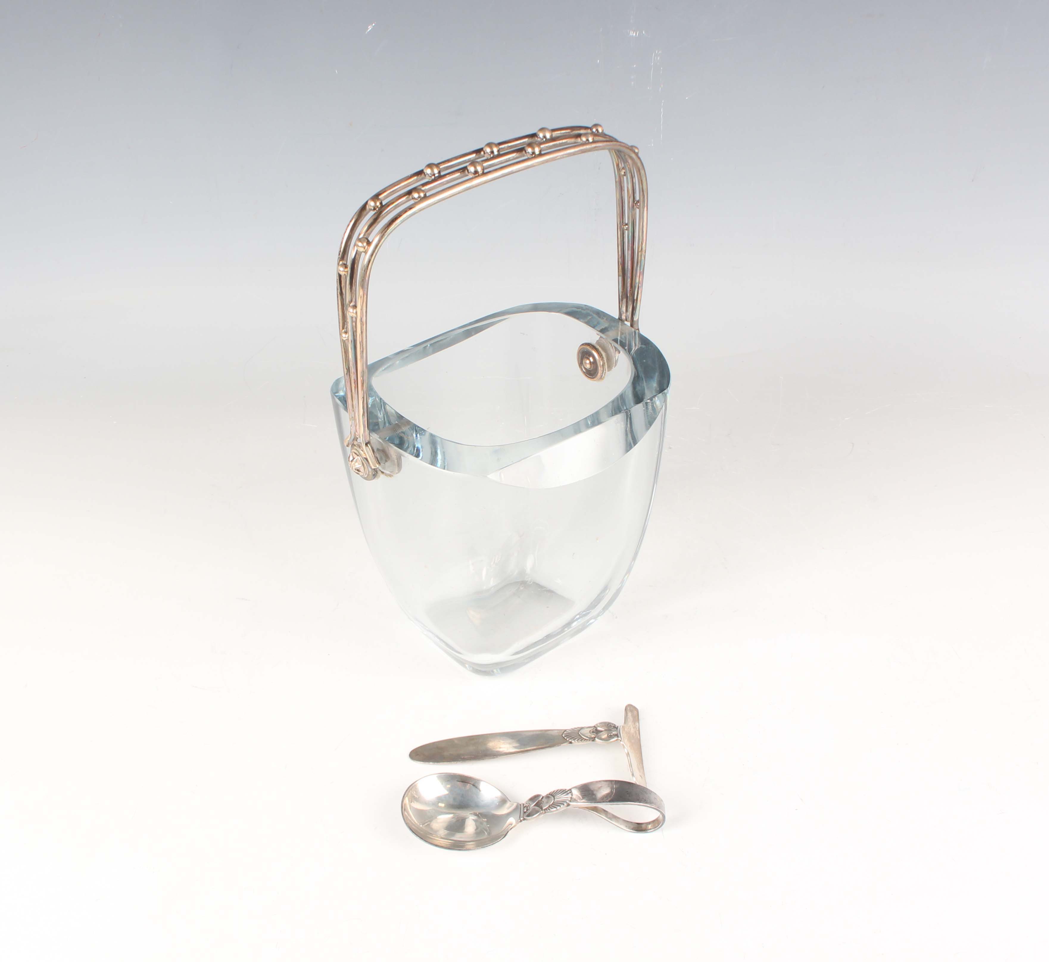 A Georg Jensen sterling cactus pattern christening spoon and pusher, import marks, London 1963 and 1965, total weight 44.7g, length of spoon 9.6cm, together with a Danish sterling mounted glass ice bucket by Einar Dragsted, the swing handle with beaded decoration and detailed 'Denmark Sterling', total height 21cm.