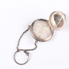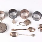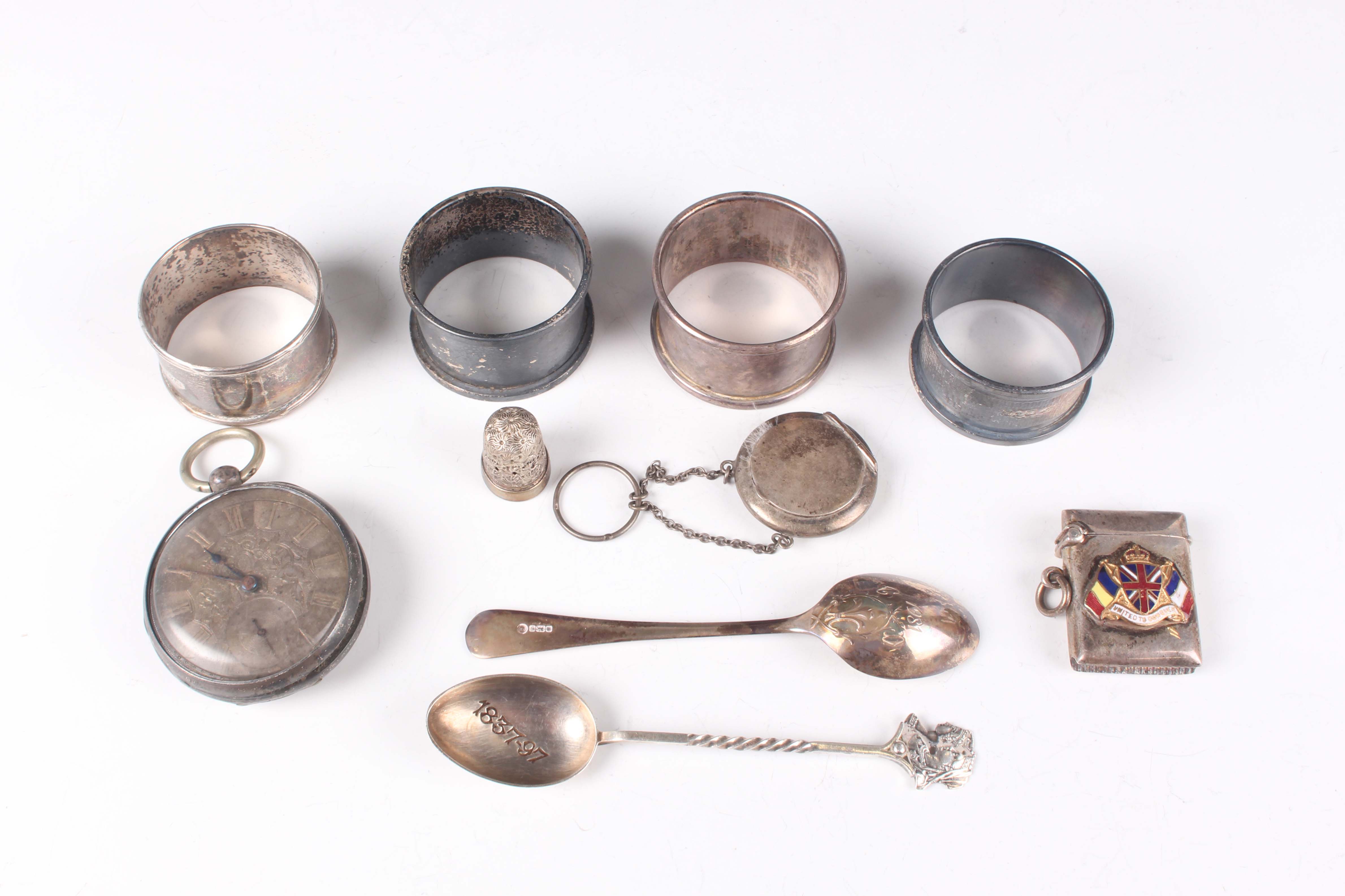 A small group of silver, including four napkin rings, a rouge pot, the hinged lid fitted with a mirror, Birmingham 1917, and a silver cased gentleman's pocket watch, London 1843, weighable items 116.2g.