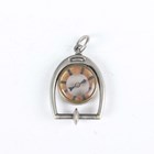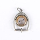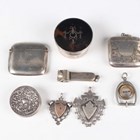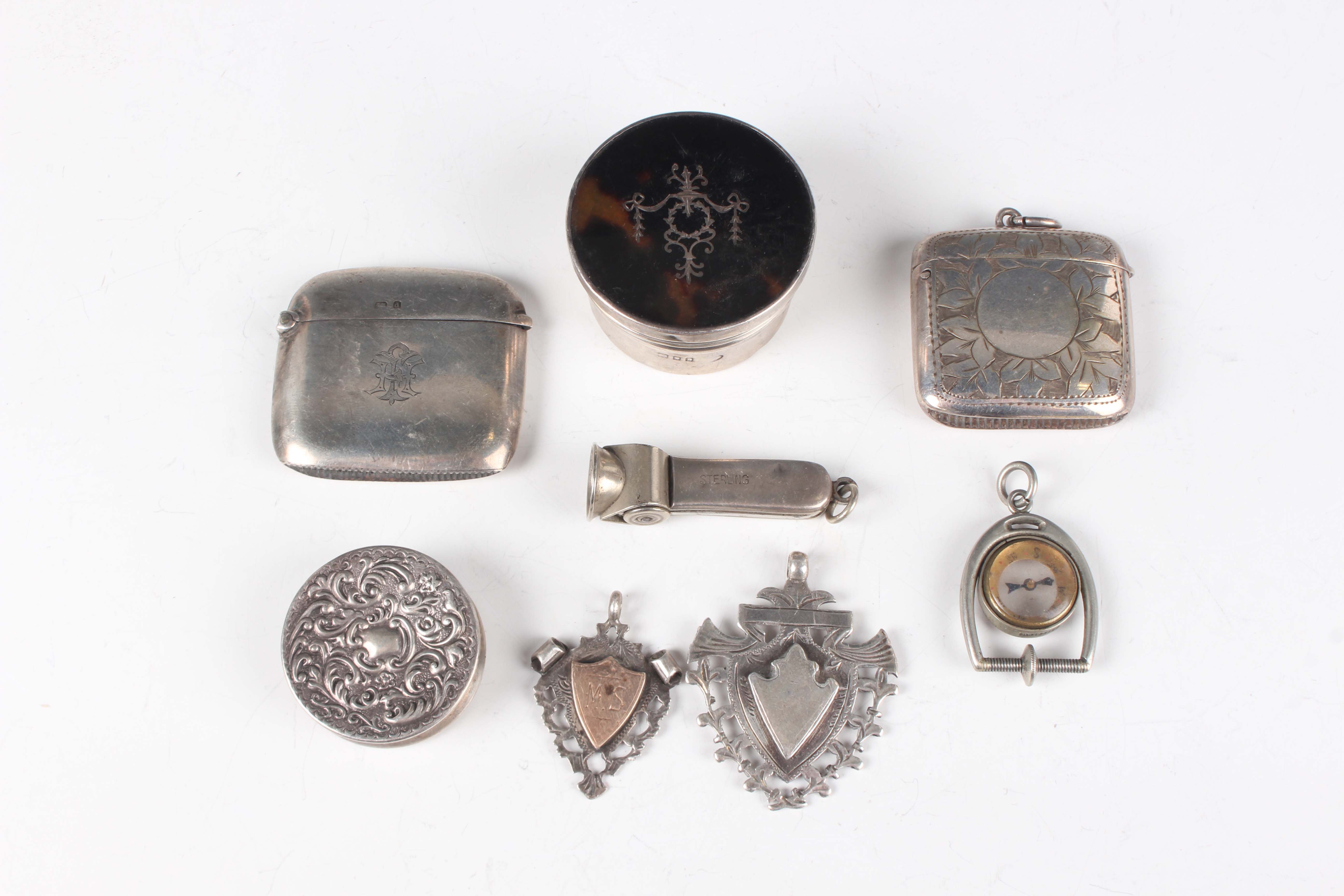 A George V silver and tortoiseshell circular pot and cover, the cover piqué inlaid with pendant garlands, London 1923, two silver fob medallions, a silver circular pill box, Birmingham 1898, a silver vesta case and a sterling cigar cutter, total weight 87.7g, together with a plated vesta case and a plated compass in the form of a stirrup, length 4cm.