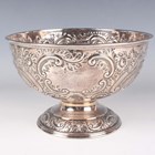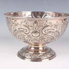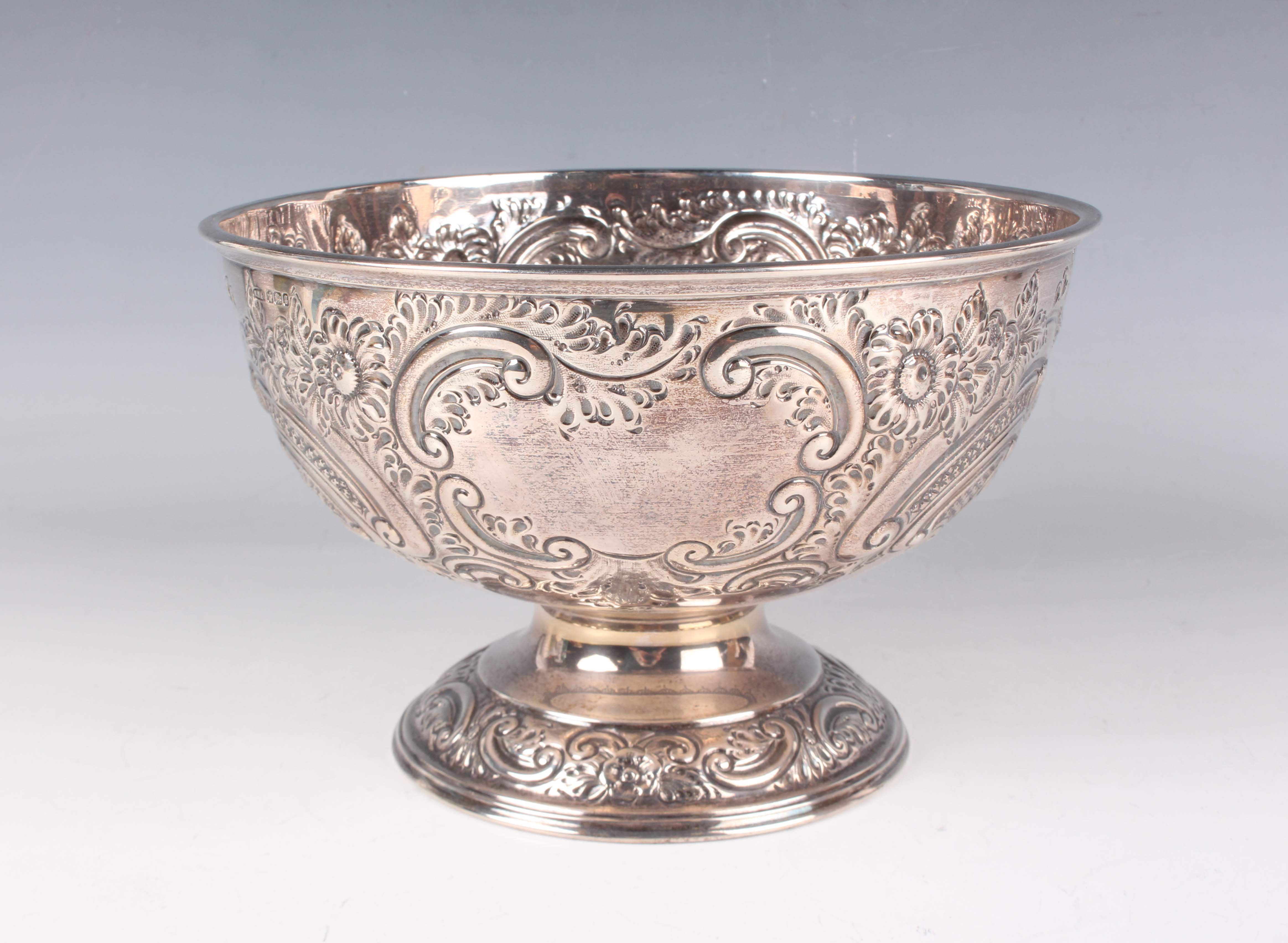 A late Victorian silver rose bowl, embossed with flowers, lattice panels and 'C' scrolls, on a similarly decorated circular foot, Sheffield 1899 by William Mammatt & Son, weight 436.1g, height 13.7cm.