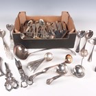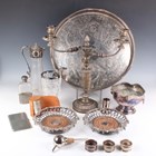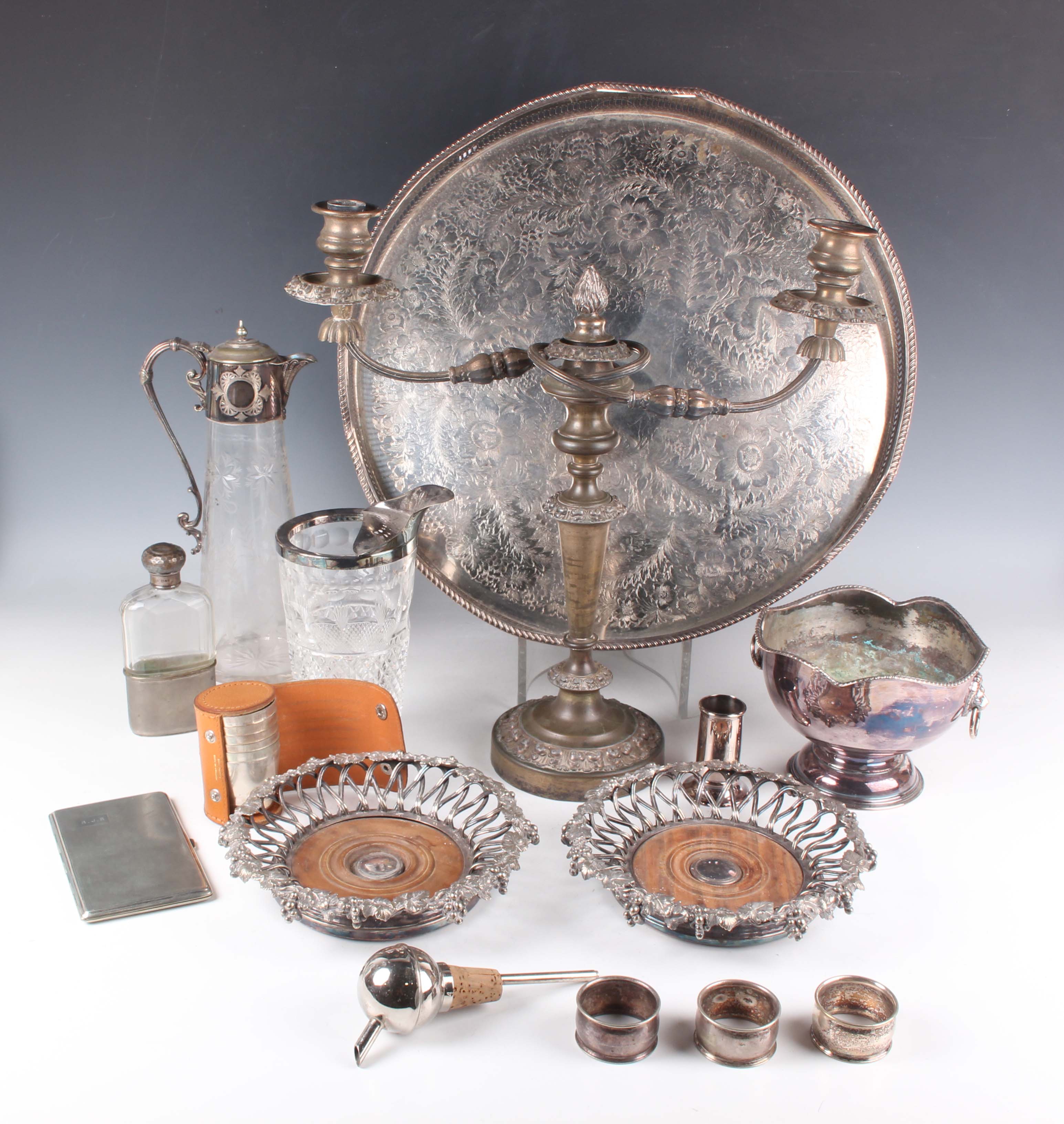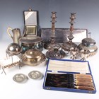 A group of plated items, including a pair of Elkington & Co wine coasters, each cast with fruiting vines above wirework sides, diameter 20.5cm, a Sheffield plate oval biscuit box, a salver, a chamberstick and various cutlery.