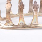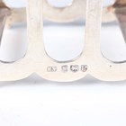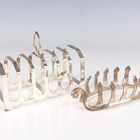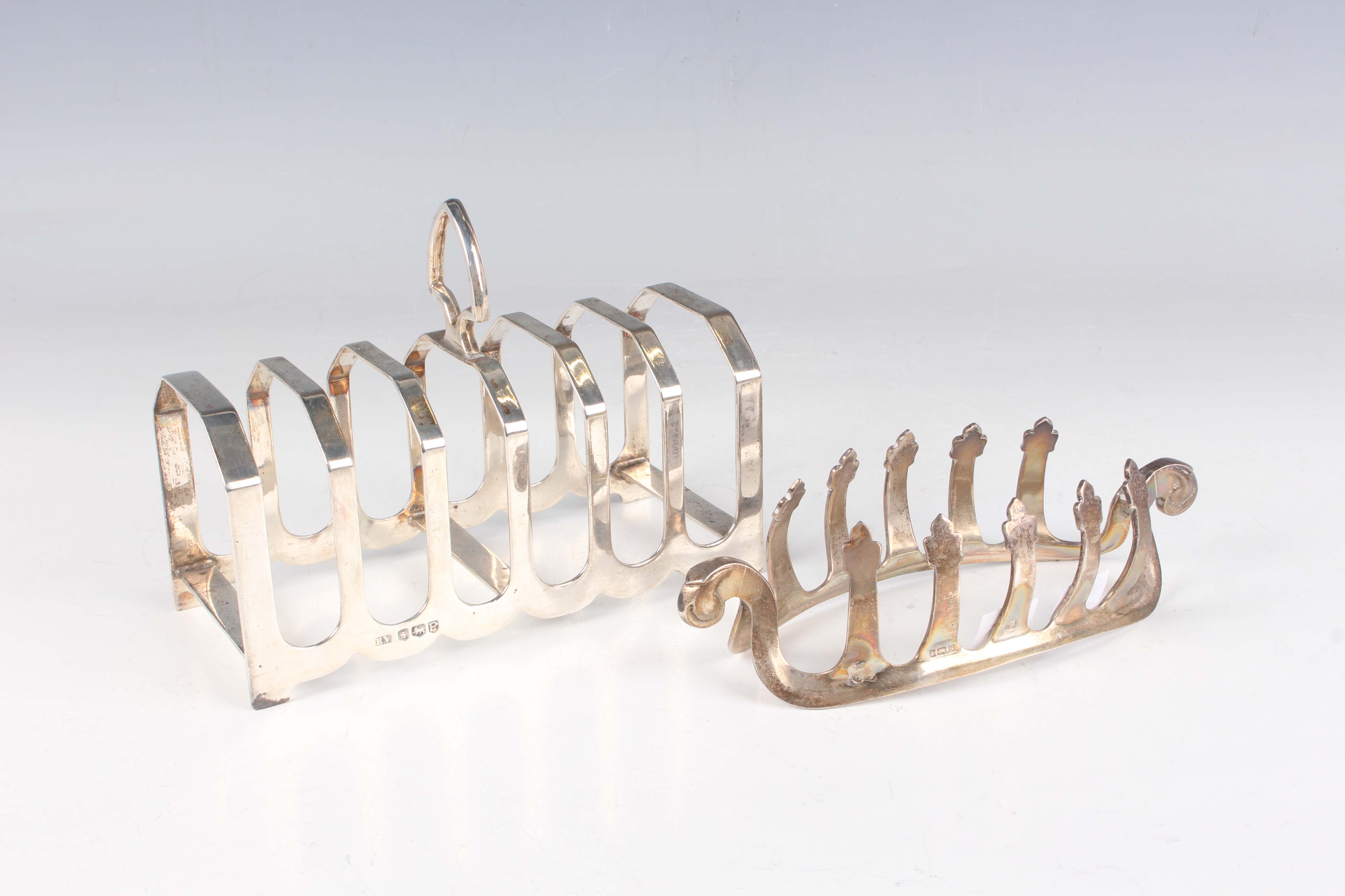 An Elizabeth II silver six-division toast rack, Sheffield 1957 by Viner's Ltd, length 14cm, and another silver six-division toast rack in a stylized Viking longboat design, Birmingham 1952 by AHA, length 14.5cm, total weight 263g.