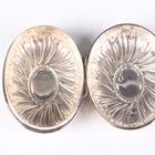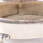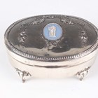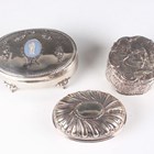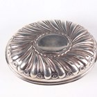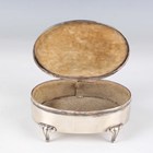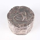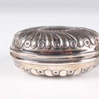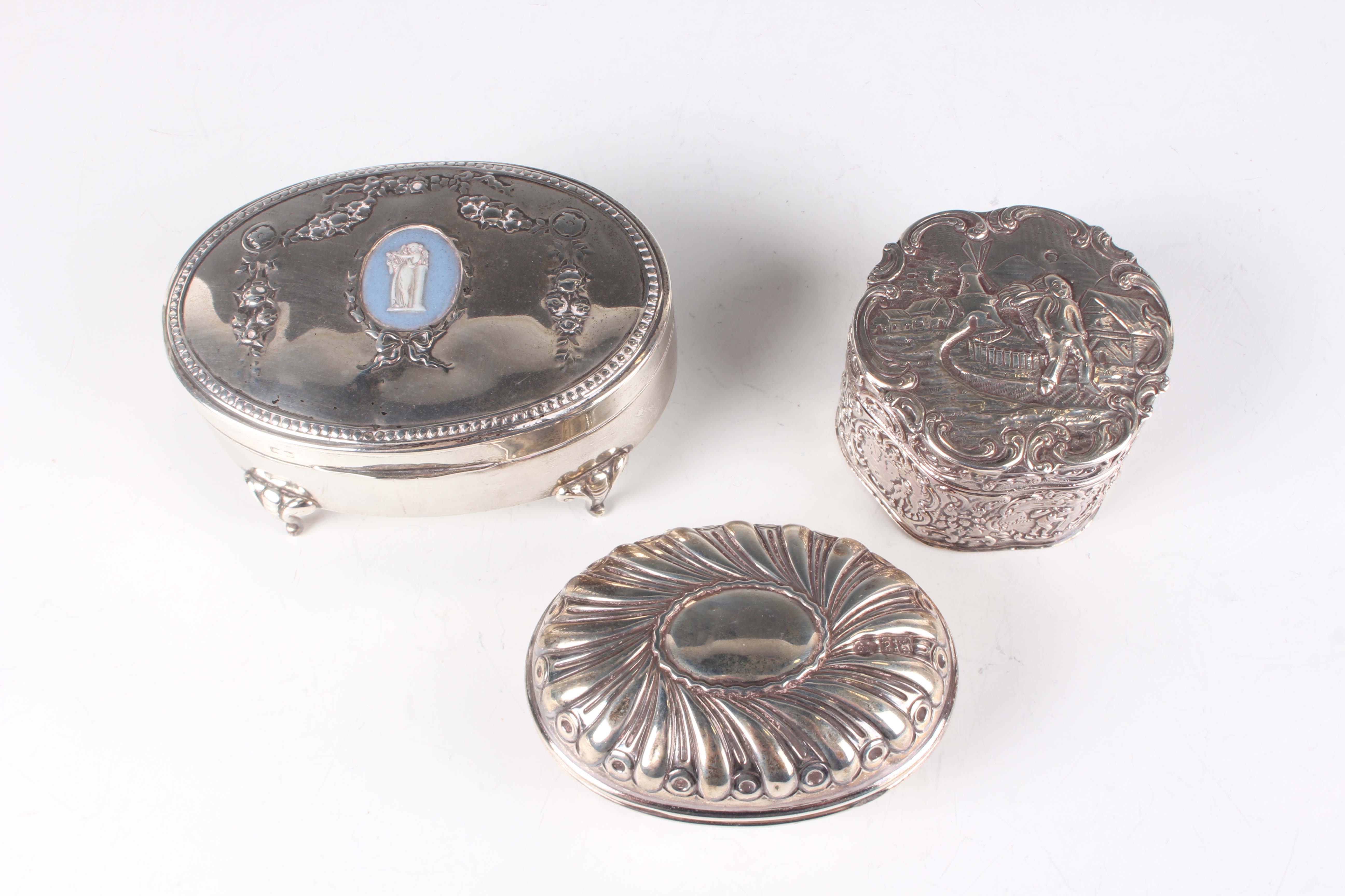 A late Victorian silver oval spiral reeded snuff box with hinged lid, London 1896 by William Comyns & Sons, weight 78.8g, length 8.8cm, a silver oval trinket box with pendant garland decoration, on scroll legs, Birmingham 1907, length 11cm, and a Dutch silver circular lobed box with hinged lid, decorated in relief with figures, windmills and buildings, weight 84.2g, height 4.1cm.