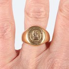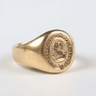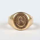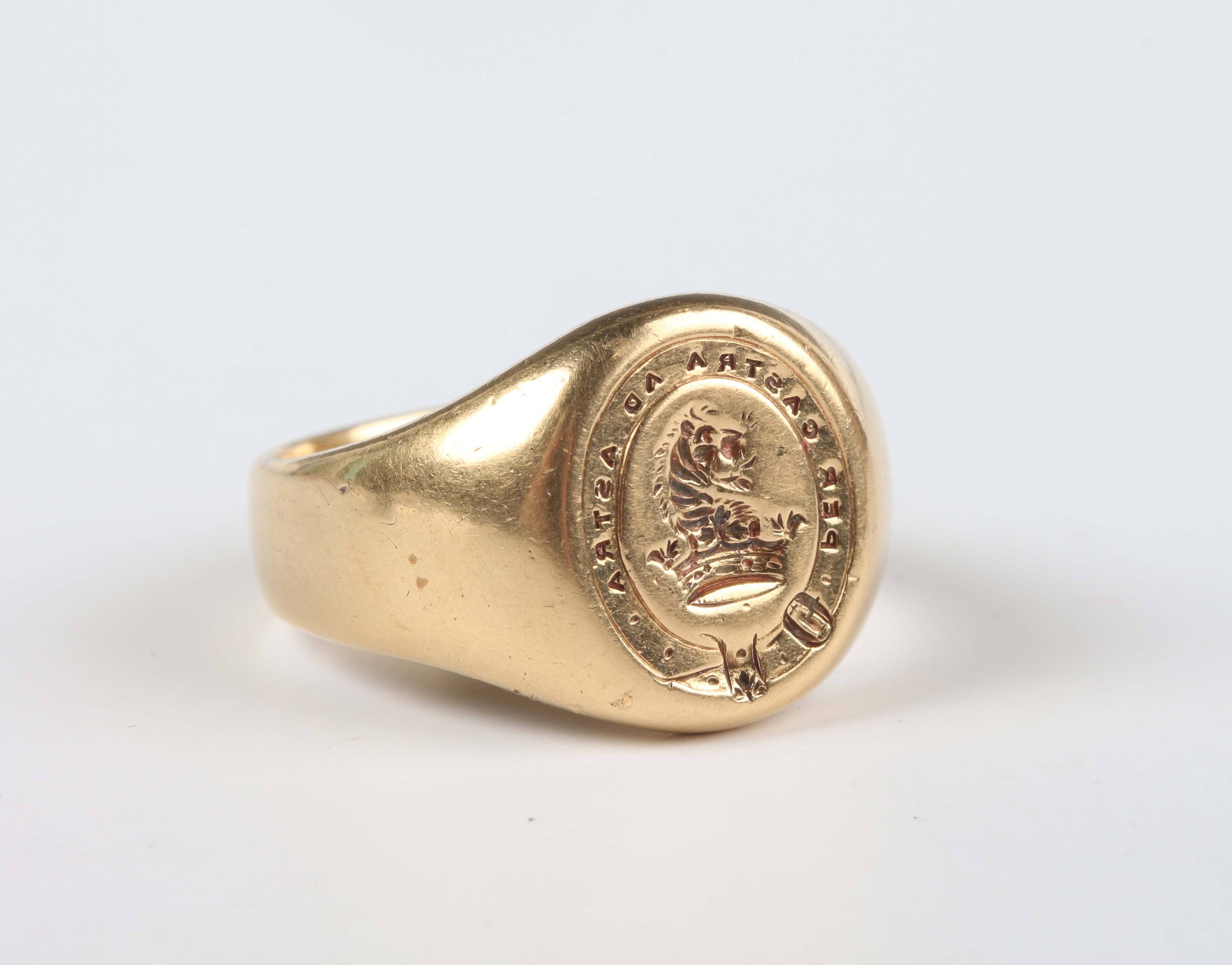An 18ct gold oval signet ring, engraved with a crest and motto ‘Per castra ad astra’ (Through the camp, to the stars), Birmingham 1883, weight 11.6g, ring size approx R.